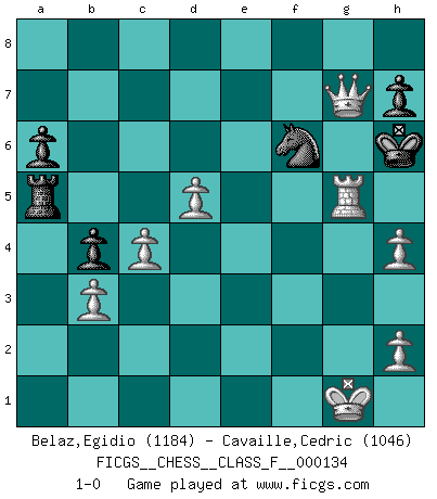 Last move : 1-0 2013 September 17 21:32:53 [Event "FICGS__CHESS__CLASS_F__000134"] [Site "FICGS"] [Date "2013.08.18"] [Round "1"] [White "Belaz,Egidio"] [Black "Cavaille,Cedric"] [Result "1-0"] [WhiteElo "1184"] [BlackElo "1046"] 1.e4 e5 2.Nf3 Nc6 3.Nc3 Nf6 4.Bc4 d6 5.O-O Qe7 6.Bb5 Bd7 7.d3 Qe6 8.Ng5 Qe7 9.Nd5 Nxd5 10.exd5 Nd4 11.Bxd7+ Qxd7 12.c3 Nf5 13.c4 Be7 14.Ne4 O-O 15.b3 c5 16.a4 a6 17.Bg5 Bxg5 18.Nxg5 f6 19.Ne6 Rfc8 20.Qg4 Nh6 21.Qe2 b5 22.a5 b4 23.Qe4 Qf7 24.f4 exf4 25.Rxf4 Qg6 26.Qe3 Ra7 27.d4 Re7 28.Raf1 f5 29.R1f3 Ng4 30.Qe2 Qh6 31.Rxf5 Nf6 32.Qd3 Qh4 33.dxc5 Rxc5 34.g3 Rxe6 35.gxh4 Re7 36.Re3 Rxe3 37.Qxe3 Rxa5 38.Qe6+ Kf8 39.Qxd6+ Kf7 40.Qc7+ Kg6 41.Rg5+ Kh6 42.Qxg7+ 1-0 Four knights : Italian variation Kingside Castling by player White (move 5) Kingside Castling by player Black (move 14) Player White won this chess game. Follow this game move after move (download)The combination player thinks forward; he starts from the given position, and tries the forceful moves in his mind. (Emanuel Lasker) Mit Schach schule ich mein Gefühl für Geometrie, was für Tennis und Schach gleichermaßen wichtig ist. (Boris Becker) Un mal plan es mejor que no tener ningún plan. (Frank Marshall) J'apprécie les joueurs d'est-indienne, c'est grâce à eux que je nourris ma famille depuis tant d'années. (Petrosian) Hold em is to stud what chess is to checkers. (Johnny Moss)