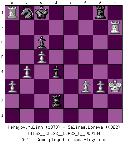 Last move : 0-1 2014 April 10 7:40:22 [Event "FICGS__CHESS__CLASS_F__000134"] [Site "FICGS"] [Date "2013.08.18"] [Round "1"] [White "Kehayov,Yulian"] [Black "Salinas,Loreva"] [Result "0-1"] [WhiteElo "1079"] [BlackElo "0922"] 1.d4 d6 2.c4 d5 3.c5 e5 4.e3 e4 5.g3 Nf6 6.Bg2 Ng4 7.Ne2 Qf6 8.Nf4 c6 9.O-O Qh6 10.h3 g5 11.hxg4 f5 12.Ne2 f4 13.exf4 Be7 14.fxg5 Bxg5 15.Bxg5 Qxg5 16.f3 Qe3+ 17.Rf2 h5 18.gxh5 Na6 19.Qd2 Qxd2 20.Nxd2 e3 21.R2f1 exd2 22.Rfd1 Rxh5 23.Rxd2 Bh3 24.Nf4 Bxg2 25.Kxg2 Rh6 26.a3 O-O-O 27.Rh1 Rg6 28.b4 Rf6 29.Re2 Rg8 30.Rh7 Rxf4 31.R2e7 Rxd4 32.Rxb7 Rd2+ 33.Kh3 d4 34.Rxa7 Nb8 35.Rac7+ Kd8 36.Rb7 Na6 37.Ra7 Nb8 38.Ra8 Kc8 0-1 Old Indian defense Kingside Castling by player White (move 9) Queenside Castling by player Black (move 26) Player Black won this chess game. Follow this game move after move (download)Strategy requires thought, tactics require observation. (Max Euwe) Die Arbeit ist etwas Unnatürliches. Die Faulheit allein ist göttlich. (Anatole France) Los Peones son nacidos libres, y aún así, se encuentran por doquier encadenados. (Rick Kennedy) Les pièces de l'échiquier étaient impitoyables. Elles le retenaient, elles l'absorbaient. Il y avait de l'horreur en cela, mais aussi une harmonie unique. Car, qu'y a-t-il dans le monde, à part les échecs ? (V. Nabokov) Over-the-board chess is the favorite of mortals, correspondence chess is the favorite of the gods. (Eduard Dyckhoff)