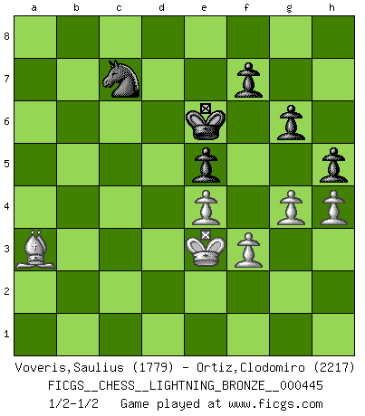 Last move : 1/2-1/2 2013 August 19 0:48:1 [Event "FICGS__CHESS__LIGHTNING_BRONZE__000445"] [Site "FICGS"] [Date "2013.08.18"] [Round "1"] [White "Voveris,Saulius"] [Black "Ortiz,Clodomiro"] [Result "1/2-1/2"] [WhiteElo "1779"] [BlackElo "2217"] 1.d4 Nf6 2.c4 e6 3.Nc3 Bb4 4.f3 d5 5.a3 Bxc3+ 6.bxc3 c5 7.cxd5 Nxd5 8.dxc5 Qa5 9.e4 Nf6 10.Be3 O-O 11.Qb3 Nfd7 12.a4 Qc7 13.Qa3 b6 14.a5 Bb7 15.Bb5 Nxc5 16.Ne2 Ba6 17.Bxa6 Nbxa6 18.axb6 axb6 19.O-O Rfd8 20.Nd4 h5 21.Rfd1 e5 22.Nc2 Nd3 23.Rdb1 Rdc8 24.Ne1 Nxe1 25.Rxe1 Qxc3 26.Qxc3 Rxc3 27.Bxb6 Nc7 28.Rxa8+ Nxa8 29.Ba5 Rc5 30.Bb4 Rc6 31.Rd1 Kh7 32.Rd6 Rc1+ 33.Kf2 Rc2+ 34.Rd2 Rxd2+ 35.Bxd2 Nb6 36.Bc3 Nd7 37.Ke3 Kg6 38.h3 Kg5 39.g3 g6 40.Be1 Kf6 41.h4 Nc5 42.Bb4 Na6 43.Bd6 Ke6 44.Ba3 Nc7 45.g4 1/2-1/2 Nimzo-Indian : Kmoch variation Kingside Castling by player Black (move 10) Kingside Castling by player White (move 19) This chess game ended in a draw. Follow this game move after move (download)Chess is so inspiring that I do not believe a good player is capable of having an evil thought during the game. (Wilhelm Steinitz) Matt entspricht nicht immer den Tatsachen. (Savielly Grigorievitsch Tartakower) El tablero es el mundo, las piezas es el fenomeno del universo, las reglas del juego son lo que llamamos leyes de la naturaleza y el jugador del lado opuesto, se encuentra oculto a nuestra vista. (Thomas Huxley) Un millionnaire : 'Monsieur Steinitz ! Vous ne participez aux tournois que pour l'argent, alors que moi je n'y viens que pour l'honneur.' Steinitz : 'Chacun joue pour ce qu'il n'a pas'... Perfection is achieved, not when there is nothing more to add, but when there is nothing left to take away. (Antoine de Saint-Exupéry)