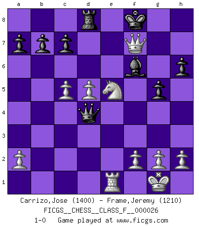 Last move : 1-0 2007 March 2 15:29:7 [Event "FICGS__CHESS__CLASS_F__000026"] [Site "FICGS"] [Date "2007.02.05"] [Round "1"] [White "Carrizo,Jose"] [Black "Frame,Jeremy"] [Result "1-0"] [WhiteElo "1400"] [BlackElo "1210"] 1.e4 e5 2.Nf3 Nf6 3.Nxe5 d6 4.Nf3 Nxe4 5.d4 d5 6.Bd3 Bf5 7.O-O Bd6 8.c4 O-O 9.cxd5 Re8 10.Nc3 Nxc3 11.bxc3 Bxd3 12.Qxd3 Nd7 13.Bg5 Nf6 14.Rfe1 Rxe1+ 15.Rxe1 h6 16.Bxf6 Qxf6 17.c4 Kf8 18.c5 Be7 19.Qh7 g5 20.Ne5 Rd8 21.Ng4 Qxd4 22.Ne5 Bf6 23.Qxf7+ 1-0 Petrov : Classical attack Kingside Castling by player White (move 7) Kingside Castling by player Black (move 8) Player White won this chess game. Follow this game move after move (download)Botvinnik tried to take the mystery out of Chess, always relating it to situations in ordinary life. He used to call Chess a typical inexact problem similar to those which people are always having to solve in everyday life. (Garry Kasparov) Über Karpov: Er war und ist ein Vertreter der russischen Reaktionäre. Das steckt tief in seiner Seele, wehalb ich nicht nett mit ihm umgehen kann. (Viktor Kortschnoi) La enorme capacidad mental, en la que sin ella no puede un jugador de Ajedrez existir, es demasiado requerida por el Ajedrez al grado de que nunca podrá liberar su mente de este juego. (Albert Einstein) Il n'y a pas de prix trop élevé au scalp de l'ennemi. (Koblentz) Art is the only way to run away without leaving home. (Twyla Tharp)