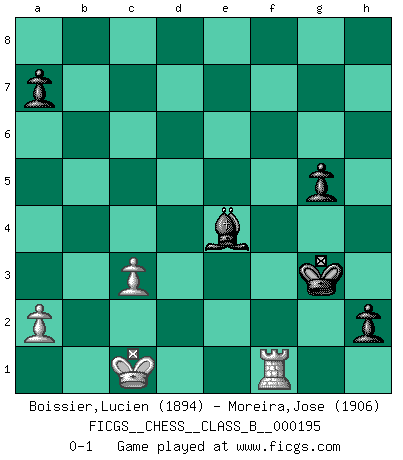 Last move : 0-1 2013 November 18 15:30:6 [Event "FICGS__CHESS__CLASS_B__000195"] [Site "FICGS"] [Date "2013.08.21"] [Round "1"] [White "Boissier,Lucien"] [Black "Moreira,Jose"] [Result "0-1"] [WhiteElo "1894"] [BlackElo "1906"] 1.d4 Nf6 2.Bg5 d5 3.Bxf6 exf6 4.e3 Bd6 5.c4 dxc4 6.Bxc4 O-O 7.Nc3 f5 8.Nf3 Nd7 9.Qc2 Nf6 10.O-O-O c6 11.h4 h6 12.Kb1 Qa5 13.d5 Bb4 14.dxc6 Bxc3 15.Qxc3 Qxc3 16.bxc3 Ne4 17.Rd4 Nxf2 18.Rf1 Ng4 19.Rxg4 fxg4 20.Ne5 Kh7 21.Nxf7 bxc6 22.Ng5+ hxg5 23.Rxf8 gxh4 24.Bd3+ Kh6 25.Be4 h3 26.Bxc6 Bb7 27.Rxa8 Bxc6 28.Rh8+ Kg6 29.g3 Kf5 30.Rh4 Ke4 31.Rxg4+ Kf3 32.Rf4+ Kxg3 33.Rf1 g5 34.Kc1 h2 35.e4 Bxe4 0-1 Trompowsky attack (Ruth, Opovcensky Opening) Kingside Castling by player Black (move 6) Queenside Castling by player White (move 10) 10 pieces endgame at move 32 : White KRPPP , Black KBPPP WHITE : King + 1 Rook 3 Pawns BLACK : King + 1 Bishop 3 Pawns 9 pieces endgame at move 35 : White KRPP , Black KBPPP WHITE : King + 1 Rook 2 Pawns BLACK : King + 1 Bishop 3 Pawns Player Black won this chess game. Follow this game move after move (download)Everything is in a state of flux, and this includes the world of Chess. (Mikhail Botvinnik) Um dein Spiel zu verbessern musst du zuallererst das Endspiel studieren, denn diese kann unabhängig studiert werden. Die Eröffnung und das Mittelspiel müssen immer in Bezug gesetzt werden zum Endspiel. (José Raúl Capablanca) La última cosa en que Fischer estaba interesado era en tonterías, siempre y cuando el Ajedrez estuviera involucrado. (Elie Agur) La tactique est l'élément le plus important du milieu de jeu. (Siegbert Tarrasch) I don't know, I don't care, and it doesn't make any difference. (Albert Einstein)