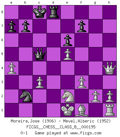 Last move : 0-1 2013 November 24 1:24:53 [Event "FICGS__CHESS__CLASS_B__000195"] [Site "FICGS"] [Date "2013.08.21"] [Round "1"] [White "Moreira,Jose"] [Black "Mevel,Alberic"] [Result "0-1"] [WhiteElo "1906"] [BlackElo "1952"] 1.e4 e6 2.d4 d5 3.Nc3 Bb4 4.e5 Ne7 5.Qg4 c5 6.dxc5 Nbc6 7.Qxg7 Rg8 8.Qxh7 d4 9.a3 Qa5 10.Rb1 dxc3 11.Be3 Bd7 12.Ne2 Rg6 13.axb4 Nxb4 14.Qh8+ Rg8 15.Qh7 Ba4 16.b3 O-O-O 17.bxa4 Nf5 18.Rxb4 Qxb4 19.Bc1 Rgf8 20.Bg5 Rd2 21.f3 Qxc5 22.Bxd2 cxd2+ 23.Kxd2 Rd8+ 24.Ke1 Ne3 25.c3 Nd1 26.Qh4 Nb2 0-1 French : Winawer, Advance variation Queenside Castling by player Black (move 16) Player Black won this chess game. Follow this game move after move (download)All Chess players should have a hobby. (Savielly Tartakower) Schach verlangt totale Konzentration. (Robert James Fischer) En un gambito tu regalas un Peón por el bién de tomar un juego perdido. (Samuel Standige Boden) Ne tendez aucun piège pour le plaisir ! Ne jouez rien dans l'espoir que l'adversaire réagisse de façon stupide ! Prenez toujours pour acquis que l'adversaire va trouver le meilleur coup ! Ne jouez jamais de coup dans l'espoir que l'adversaire ne voie pas la menace ! Chacun de vos coups doit améliorer la position d'une façon ou d'une autre. Somewhere in the world there is an epigram for every dilemma. (Hendrik Willem van Loon)