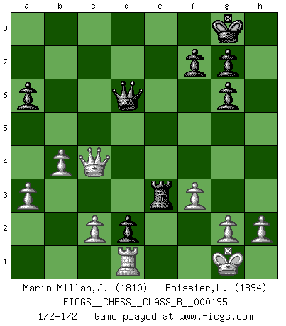 Last move : 1/2-1/2 2014 February 20 19:51:27 [Event "FICGS__CHESS__CLASS_B__000195"] [Site "FICGS"] [Date "2013.08.21"] [Round "1"] [White "Marin Millan,Jose Antonio"] [Black "Boissier,Lucien"] [Result "1/2-1/2"] [WhiteElo "1810"] [BlackElo "1894"] 1.e4 c5 2.Nf3 Nc6 3.d4 cxd4 4.Nxd4 Nf6 5.Nc3 e6 6.Ndb5 Bb4 7.a3 Bxc3+ 8.Nxc3 d5 9.exd5 exd5 10.Bd3 O-O 11.O-O d4 12.Ne2 Bg4 13.f3 Bh5 14.b4 Qb6 15.Bb2 Rad8 16.Nf4 Bg6 17.Nxg6 hxg6 18.Re1 Rfe8 19.Rxe8+ Rxe8 20.Qd2 Nd5 21.Kh1 a6 22.Rc1 Re5 23.Qf2 Re7 24.Re1 Ne3 25.Qh4 Qd8 26.Be4 Qd6 27.Kg1 Ne5 28.Bc1 N5c4 29.Bd3 b5 30.Bxc4 bxc4 31.Bxe3 Rxe3 32.Rd1 d3 33.Qxc4 d2 1/2-1/2 Sicilian defense Kingside Castling by player Black (move 10) Kingside Castling by player White (move 11) This chess game ended in a draw. Follow this game move after move (download)Every Pawn is a potential Queen. (James Mason) Der Traum, für den ich lebe, ist der von einem freien Russland. Viele mögen sagen: Russland hat doch ein Parlament, einen gewählten Präsidenten. Aber ich spüre, dass in meiner Heimat die Angst wiederkehrt. Eine Angst, sich frei zu äußern, bestimmte Dinge zu tun (Garry Kasparov) Con el fin de mejorar tu juego, debes de estudiar los finales antes que todo, ya que mientras que los finales pueden ser estudiados y dominados por sí mismos, el juegomedio y la apertura deben de ser estudiados en relación con los finales. (José Raúl Capablanca) Les Echecs sont et restent toujours un combat, un combat intégral comme la boxe, la lutte ou un autre sport, et où il doit y avoir un vainqueur et un vaincu. (Joseph Emil Diemer) To steal ideas from one person is plagiarism. To steal from many is research. (Unknown)