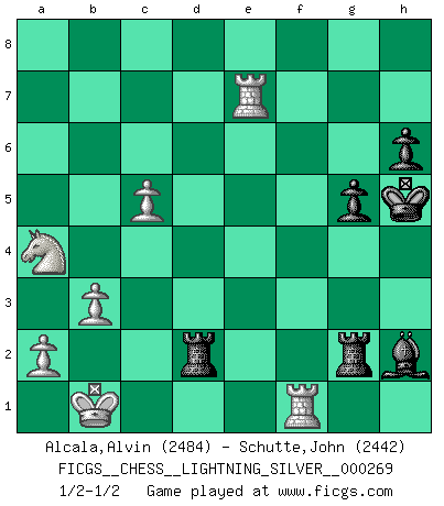 Last move : 1/2-1/2 2013 August 24 18:9:39 [Event "FICGS__CHESS__LIGHTNING_SILVER__000269"] [Site "FICGS"] [Date "2013.08.24"] [Round "1"] [White "Alcala,Alvin"] [Black "Schutte,John"] [Result "1/2-1/2"] [WhiteElo "2484"] [BlackElo "2442"] 1.e4 c5 2.Nf3 d6 3.d4 cxd4 4.Nxd4 Nf6 5.Nc3 a6 6.Be3 e5 7.Nb3 Be6 8.h3 Be7 9.g4 d5 10.exd5 Nxd5 11.Bg2 Nxe3 12.Qxd8+ Bxd8 13.fxe3 Bh4+ 14.Kf1 Nc6 15.Bd5 Nb4 16.Bxb7 Rb8 17.Be4 O-O 18.Nc5 Rbc8 19.N3a4 Bd5 20.Bxd5 Nxd5 21.Ke2 Bg5 22.c3 Nxe3 23.Nxa6 Rfe8 24.h4 Bf4 25.Kf3 Rf8 26.N6c5 f5 27.gxf5 Nxf5 28.Ne4 Be3 29.b3 Ba7 30.Ke2 Ne3 31.Rh3 Ng2 32.Rf3 Nf4+ 33.Kd2 Rfd8+ 34.Kc2 Rd4 35.Nd2 Ng2 36.Rg3 Nxh4 37.Rh3 Rg4 38.Re1 Ng2 39.Rxe5 Nf4 40.Rh2 Bg1 41.Rh1 Rg2 42.Re1 Bf2 43.Re4 Rd8 44.Rxf4 Be3 45.Re4 R8xd2+ 46.Kb1 Bg1 47.Re8+ Kf7 48.Re1 Bh2 49.Rhf1+ Kg6 50.Re6+ Kh5 51.Re7 h6 52.c4 g5 53.c5 1/2-1/2 Sicilian : Najdorf, Byrne (English) attack Kingside Castling by player Black (move 17) This chess game ended in a draw. Follow this game move after move (download)Of all my Russian books, the defense contains and diffuses the greatest 'warmth' which may seem odd seeing how supremely abstract Chess is supposed to be. (Vladimir Nabokov) Die westlichen Werte sind eine Sprache, welche die Putin-Administration nicht versteht. (Garry Kasparov) El Ajedrez es como la guerra en un tablero. (Bobby Fischer) Mais n'est-ce pas déjà le limiter injurieusement que d'appeler les échecs un jeu? N'est-ce pas aussi une science, un art, ou quelque chose qui, comme le cercueil de Mahomet entre ciel et terre, est suspendu entre l'un et l'autre, et qui réunit un nombre incroyable de contraires ? (Stefan Zweig) Treat your password like your toothbrush. Don't let anybody else use it, and get a new one every six months. (Clifford Stoll)