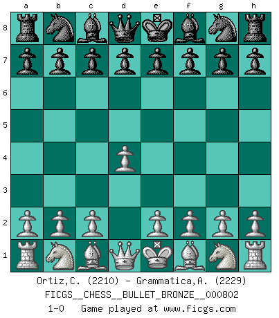 Last move : 1-0 2013 August 28 17:19:37 [Event "FICGS__CHESS__BULLET_BRONZE__000802"] [Site "FICGS"] [Date "2013.08.28"] [Round "1"] [White "Ortiz,Clodomiro"] [Black "Grammatica,Andrea"] [Result "1-0"] [WhiteElo "2210"] [BlackElo "2229"] 1.d4 1-0 This chess game has been lost on time (started : 2013.08.28 15:48:29) Queen's pawn Player White won this chess game. Follow this game move after move (download)Blessed be the memory of him who gave the world this immortal game. (A. G. Gardiner) Ich bin Weltmeister und muß mit niemandem irgend etwas diskutieren. (Viswanathan Anand) No es tiempo de jugar al Ajedrez cuando la casa esta en llamas. (Proverbio Italiano) Les ravages du H expliquent la différence de niveau entre Tal et Thal [Abergel]. Difficult things take a long time, impossible things a little longer. (Author unknown)