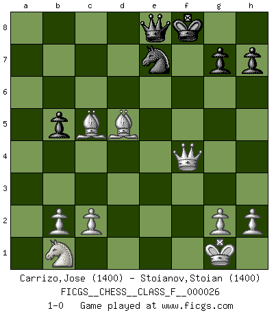 Last move : 1-0 2007 February 25 16:36:56 [Event "FICGS__CHESS__CLASS_F__000026"] [Site "FICGS"] [Date "2007.02.05"] [Round "1"] [White "Carrizo,Jose"] [Black "Stoianov,Stoian"] [Result "1-0"] [WhiteElo "1400"] [BlackElo "1400"] 1.e4 e5 2.Nf3 Nc6 3.Bb5 a6 4.Ba4 b5 5.Bb3 Nf6 6.O-O Be7 7.d4 exd4 8.e5 Ne4 9.Bd5 Nc5 10.Nxd4 Nxe5 11.Bxa8 c6 12.Re1 Bf6 13.f4 O-O 14.fxe5 Bh4 15.Rf1 f6 16.Qh5 fxe5 17.Rxf8+ Qxf8 18.Qxh4 exd4 19.Qxd4 Ne6 20.Qe5 a5 21.Be3 Qe8 22.a4 d6 23.Qc3 Bd7 24.Qxa5 Nf8 25.Bf2 Ng6 26.axb5 cxb5 27.Bd5+ Kf8 28.Qc7 Qe7 29.Ra8+ Be8 30.Qc6 Qe5 31.Rxe8+ Qxe8 32.Qxd6+ Qe7 33.Qb8+ Qe8 34.Bc5+ Ne7 35.Qf4+ 1-0 Ruy Lopez : Caro variation Kingside Castling by player White (move 6) Kingside Castling by player Black (move 13) Player White won this chess game. Follow this game move after move (download)You have to have the fighting spirit. You have to force moves and take chances. (Bobby Fischer) Die unerbitterlichsten Regeln im Schach sind die Ausnahmen. (Savielly Grigorievitsch Tartakower) No nos podemos resistir a la fascinación de un sacrificio ya que la pasión por los sacrificios es parte de la naturaleza de un jugador de Ajedrez. (Rudolf Spielman) Botvinnik disait en comparant les échecs à la musique: Il existe une science dont le but est l'étude de l'acoustique et des sons. Mais il y a aussi un art qui se sert de l'océan des sons : c'est la musique. De toute évidence, il en est de même pour la pensée. La logique est l'étude des lois de la réflexion et les échecs reflètent, en tant qu'art, le côté logique de la réflexion, sous la forme d'images artistiques... Extrait de Fischer - Spassky, Reykjavik 1972 par Alexander & F. Wyndham (Ed. Solar), p 37. A proverb is a short sentence based on long experience. (Miguel de Cervantes)