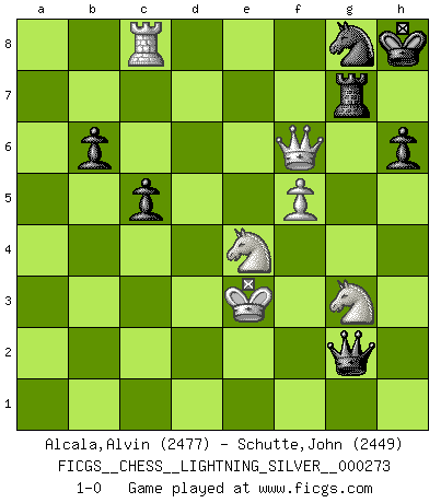 Last move : 1-0 2013 August 29 19:44:27 [Event "FICGS__CHESS__LIGHTNING_SILVER__000273"] [Site "FICGS"] [Date "2013.08.29"] [Round "1"] [White "Alcala,Alvin"] [Black "Schutte,John"] [Result "1-0"] [WhiteElo "2477"] [BlackElo "2449"] 1.c4 e5 2.g3 Nf6 3.Bg2 d5 4.cxd5 Nxd5 5.Nc3 Nb6 6.e3 Nc6 7.Nge2 Be7 8.O-O O-O 9.f4 f6 10.f5 a5 11.b3 Qd7 12.a3 Rd8 13.g4 Bf8 14.Ng3 Qf7 15.Nce4 Be7 16.Bb2 Bd7 17.Rc1 Be8 18.g5 Kh8 19.gxf6 gxf6 20.d4 exd4 21.exd4 a4 22.Qe2 axb3 23.d5 Nxd5 24.Ng5 Qg8 25.Ne6 Rd7 26.Rfd1 Ra5 27.Qe1 Qg4 28.Rd3 Bxa3 29.Bxa3 Rxa3 30.Bxd5 Ra2 31.Nc5 Re7 32.Qc3 Ne5 33.Rd4 Qh3 34.Rd2 Rxd2 35.Qxd2 b6 36.Nd3 Ng4 37.Rc3 Qh4 38.Rxb3 Nxh2 39.Nf2 Rg7 40.Nfe4 Ng4 41.Be6 Nh6 42.Re3 Bf7 43.Bxf7 Rxf7 44.Rd3 Re7 45.Rd8+ Ng8 46.Qc3 Rg7 47.Kf2 Qf4+ 48.Qf3 Qh4 49.Ke3 Rg4 50.Rc8 c5 51.Ne2 Rg7 52.Qf4 Qh3+ 53.N2g3 Qg2 54.Qd6 h6 55.Qxf6 1-0 English Opening Kingside Castling by player White (move 8) Kingside Castling by player Black (move 8) Player White won this chess game. Follow this game move after move (download)Chess is a forcing house where the fruits of character can ripen more fully than in life. (Edward Morgan Foster) Ich könnte leicht behaupten: Ja,ja, Leonid Breschnew wollte nicht, daß ich Weltmeister werde. In der Tat war die Sache komplizierter. (Viktor Kortschnoi) Bobby solo arroja las piezas y solas caen en las casillas correctas. (Miguel Najdorf ) La vie et les Echecs sont tous les deux une lutte constante. (Lasker) The Internet is the world's largest library. It's just that all the books are on the floor. (John Allen Paulos)