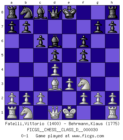 Last move : 0-1 2007 April 12 16:51:35 [Event "FICGS__CHESS__CLASS_D__000030"] [Site "FICGS"] [Date "2007.02.06"] [Round "1"] [White "Fatelli,Vittorio"] [Black "Behrmann,Klaus"] [Result "0-1"] [WhiteElo "1400"] [BlackElo "1775"] 1.d4 f5 2.Bg5 Nf6 3.Bxf6 exf6 4.e3 d5 5.Bd3 c6 6.Nf3 Bd6 0-1 This chess game has been lost on time (started : 2007.02.06 2:52:3) Dutch, 2.Bg5 variation Player Black won this chess game. Follow this game move after move (download)Chess is a matter of delicate judgment, knowing when to punch and how to duck. (Bobby Fischer) Mein erstes Ziel war nicht, die Partie zu gewinnen, sondern eine Figur zu opfern. -- der junge (Wilhelm Steinitz) El juego del Ajedrez no es solamente una diversión quieta; algunas cualidades muy valuables de la mente se pueden adquirir y cultivar con el, como convertirlos en habitos disponibles para toda ocasión; ya que la vida es algo así como el Ajedrez. (Benjamin Franklin) Les échecs sont plus proches de l'art de l'assassinat que de l'art de la guerre. (Arturo Perez-Reverte) All war is based on deception. (Sun Tzu)
