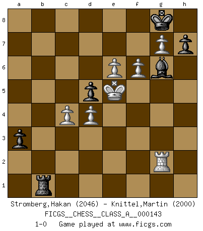 Last move : 1-0 2014 May 10 9:13:13 [Event "FICGS__CHESS__CLASS_A__000143"] [Site "FICGS"] [Date "2013.09.01"] [Round "1"] [White "Stromberg,Hakan"] [Black "Knittel,Martin"] [Result "1-0"] [WhiteElo "2046"] [BlackElo "2000"] 1.e4 e5 2.Nf3 Nc6 3.d4 exd4 4.Nxd4 Bc5 5.Nb3 Bd6 6.Bd3 a5 7.a4 Be7 8.O-O Nf6 9.f4 O-O 10.c3 d5 11.e5 Ne4 12.N1d2 Nc5 13.Bc2 b6 14.Nd4 Nxd4 15.cxd4 Ne6 16.Nb3 f5 17.g4 fxg4 18.f5 Ng5 19.Qxg4 Kh8 20.Bxg5 Bxg5 21.Kh1 c5 22.Rf3 c4 23.Nc1 Bh6 24.Ne2 Qg5 25.Qxg5 Bxg5 26.Nc3 Rb8 27.Kg2 Bh6 28.Re1 Bd2 29.Re2 Bxc3 30.bxc3 b5 31.axb5 Bd7 32.e6 Bxb5 33.Kg3 a4 34.Kf4 Bc6 35.Ke5 a3 36.Rf1 Rb2 37.Ra1 Ra8 38.Bd1 Rb3 39.Rc1 Be8 40.Rg2 Ra5 41.Bxb3 cxb3 42.Rcg1 g6 43.h4 b2 44.h5 Rb5 45.hxg6 b1Q 46.g7+ Kg8 47.Rxb1 Rxb1 48.f6 Bg6 49.c4 1-0 This chess game has been lost on time (started : 2013.09.01 8:4:48) Scotch : Potter variation Kingside Castling by player White (move 8) Kingside Castling by player Black (move 9) Promotion Queen by player Black (move 45) Player White won this chess game. Follow this game move after move (download)No other master has such a terrific will to win. At the board he radiates danger, and even the strongest opponents tend to freeze, like rabbits when they smell a panther. Even his weaknesses are dangerous. As white, his opening game is predictable - you can make plans against it - but so strong that your plans almost never work. In the middle game his precision and invention are fabulous, and in the end game you simply cannot beat him. (Anonymous German Expert) Wir irren allesamt, nur jeder irrt anders. (Georg Christoph Lichtenberg) Los errores estan ahí, esperando a que se cometan. (Savielly Tartakower) Comme les marins qui ont mille raisons différentes d'aller en mer, les joueurs d'échecs en ont tout autant avant de s'installer devant une table et jouer... (Vincent Bertignac, philosophe) I find your interest interesting. (Gregory House, House M.D.)