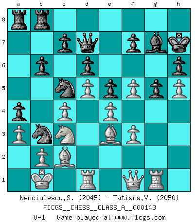 Last move : 0-1 2014 June 6 22:48:11 [Event "FICGS__CHESS__CLASS_A__000143"] [Site "FICGS"] [Date "2013.09.01"] [Round "1"] [White "Nenciulescu,Silviu"] [Black "Tatiana,Vanessa"] [Result "0-1"] [WhiteElo "2045"] [BlackElo "2050"] 1.d4 Nf6 2.c4 g6 3.Nc3 Bg7 4.e4 d6 5.Nf3 O-O 6.h3 e5 7.d5 Na6 8.Bg5 h6 9.Be3 Nc5 10.Nd2 a5 11.Be2 b6 12.g4 Qd7 13.Rg1 Qd8 14.h4 Nfd7 15.h5 g5 16.Qc2 Na6 17.a3 Bb7 18.Nf1 Nac5 19.O-O-O Qe8 20.f3 a4 21.Nd2 Qd8 22.Kb1 Bc8 23.Nb5 Nb7 24.Nf1 Nbc5 25.Ng3 Nb3 26.Nc3 Ndc5 27.Bd3 Re8 28.Nf5 Bxf5 29.gxf5 Qc8 30.Qg2 Kh7 31.Bc2 Qd7 32.Qf1 Reb8 0-1 King's Indian : 5.Nf3 Kingside Castling by player Black (move 5) Queenside Castling by player White (move 19) Player Black won this chess game. Follow this game move after move (download)White lost because he failed to remember the right continuation and had to think up the moves himself. (Siegbert Tarrasch) Spiel ein langweiliges Spiel zu Ende und lustige Dinge können passieren. (Hans Ree) Buenas posiciones no logran ganar juegos, buenas movidas sí. (Gerald Abrahams) Même si vous avez un bon coup à faire, regardez toujours s'il n'y en a pas un qui lui soit préférable. (Pedro Damiano) The best teachers teach from the heart, not from the book. (Author unknown)