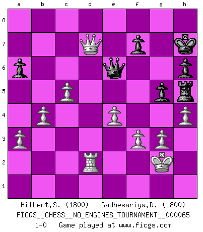 Last move : 1-0 2014 January 2 13:44:23 [Event "FICGS__CHESS__NO_ENGINES_TOURNAMENT__000065"] [Site "FICGS"] [Date "2013.09.01"] [Round "1"] [White "Hilbert,Stephan J."] [Black "Gadhesariya,Divyesh"] [Result "1-0"] [WhiteElo "1800"] [BlackElo "1800"] 1.b4 a6 2.Bb2 Nc6 3.a3 e5 4.c4 Nf6 5.e3 Be7 6.Nf3 e4 7.Nd4 O-O 8.Be2 d5 9.cxd5 Qxd5 10.Nc3 Qg5 11.Nxc6 bxc6 12.g3 Bh3 13.Bf1 Qh6 14.Qc2 Rfe8 15.Nxe4 Nxe4 16.Qxe4 Bxf1 17.Kxf1 Bf6 18.Qc2 Rad8 19.Bxf6 Qxf6 20.Kg2 h6 21.d4 Rd5 22.Rac1 c5 23.dxc5 Qc6 24.e4 Rde5 25.f3 Qb5 26.Rhd1 Kh8 27.Qd3 Qa4 28.Rd2 Qc6 29.Rc4 Qg6 30.Rd4 Rh5 31.Rd8 Rxd8 32.Qxd8+ Kh7 33.Qxc7 Qe6 34.h4 g5 35.Qd7 1-0 Polish (Sokolsky) opening Kingside Castling by player Black (move 7) Player White won this chess game. Follow this game move after move (download)A man without frontiers. He didn't divide the East and the West, he brought them together in their admiration for him. (Ljubomir Ljubojevic, about Bobby Fischer's death) Schach ist ein Teil der Kultur, und wenn es mit der Kultur abwärts geht, geht es auch mit dem Schach abwärts. (Mikhail Moiseyevich Botvinik) Si el Ajedrez es una ciencia, es la mas inexacta. Si el Ajedrez es un arte, es demasiado inexacto para ser visto como tal. Si el Ajedrez es un deporte, es demasiado esotérico. Si el Ajedrez es un juego, es demasiado exigente para ser solo un juego. Si el Ajedrez es una aventura, es una muy demandante. Si el Ajedrez es una pasión, es una muy gratificante. Si el Ajedrez es la vida, es una muy triste. (Anónimo) Les échecs, c'est l'imagination. (David Bronstein) Home computers are being called upon to perform many new functions, including the consumption of homework formerly eaten by the dog. (Doug Larson)