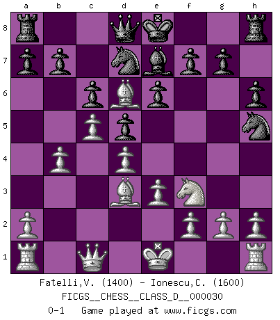 Last move : 0-1 2007 May 12 8:45:0 [Event "FICGS__CHESS__CLASS_D__000030"] [Site "FICGS"] [Date "2007.02.06"] [Round "1"] [White "Fatelli,Vittorio"] [Black "Ionescu,Catalin"] [Result "0-1"] [WhiteElo "1400"] [BlackElo "1600"] 1.d4 d5 2.Bg5 h6 3.Bh4 c6 4.Nf3 Qb6 5.Qc1 Bg4 6.Nbd2 e6 7.e3 Bd6 8.c4 Be7 9.Bg3 Nd7 10.c5 Qd8 11.b4 Ngf6 12.Bd3 Bxf3 13.Nxf3 Nh5 14.Be5 Bf6 15.Bd6 Be7 0-1 This chess game has been lost on time (started : 2007.02.06 2:52:3) Levitsky attack (Queen's Bishop attack) Player Black won this chess game. Follow this game move after move (download)If I win a tournament, I win it by myself. I do the playing. Nobody helps me. (Bobby Fischer) Die meiste Zeit treffe ich auf Gegner, die meine Enkel sein könnten. Ich bin da, um ihnen zu zeigen, dass sie von mir noch einiges lernen können. (Viktor Kortschnoi) El Ajedrez es una hermosa aventura. (Bent Larsen) En blitz, le Cavalier l'emporte sur le Fou. (Vlastimil Hort) To steal ideas from one person is plagiarism. To steal from many is research. (Unknown)