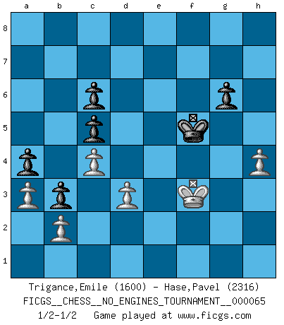 Last move : 1/2-1/2 2014 January 19 17:39:55 [Event "FICGS__CHESS__NO_ENGINES_TOURNAMENT__000065"] [Site "FICGS"] [Date "2013.09.01"] [Round "1"] [White "Trigance,Emile"] [Black "Hase,Pavel"] [Result "1/2-1/2"] [WhiteElo "1600"] [BlackElo "2316"] 1.e4 Nf6 2.Nc3 e5 3.Bc4 Nc6 4.d3 Bc5 5.Bg5 d6 6.Na4 Nd4 7.Nxc5 dxc5 8.c3 Ne6 9.Be3 Qd6 10.h3 c6 11.a3 O-O 12.Qe2 a5 13.Nf3 b5 14.Ba2 Nd7 15.O-O Ba6 16.Rad1 b4 17.Bxe6 Qxe6 18.c4 a4 19.Qd2 b3 20.Ng5 Qg6 21.f4 exf4 22.Bxf4 h6 23.Nf3 Bc8 24.Nh4 Qe6 25.Nf5 Ne5 26.Bxe5 Qxe5 27.Rf3 Bxf5 28.Rxf5 Qd4+ 29.Kh1 Rfd8 30.Rf2 Rd7 31.Qf4 Re8 32.Rfd2 Red8 33.Qf3 Qe5 34.Qf2 Rd4 35.Kg1 R8d6 36.Qf1 Rg6 37.Rf2 Rd7 38.Qe2 R7d6 39.Rdf1 Qd4 40.Kh1 Rd7 41.Rf3 Rgd6 42.Rd1 Rf6 43.Rdf1 Rxf3 44.Rxf3 Re7 45.Rf2 Re6 46.Rf3 g6 47.Qf2 Qxf2 48.Rxf2 Kg7 49.Kg1 Rd6 50.Rf3 Kf8 51.Kf2 Ke7 52.Ke2 Ke6 53.Kd2 f6 54.g4 Ke5 55.Kc3 Rd7 56.Rf2 Rg7 57.Rf1 Rf7 58.Rf2 Rh7 59.Rf1 h5 60.gxh5 Rxh5 61.Rf3 Rh4 62.Kd2 Rf4 63.Ke3 Rxf3+ 64.Kxf3 f5 65.exf5 Kxf5 66.h4 Ke5 67.Ke3 Kf5 68.Kf3 Ke5 69.Ke3 Kf5 70.Kf3 1/2-1/2 Alekhine's defense Kingside Castling by player Black (move 11) Kingside Castling by player White (move 15) This chess game ended in a draw. Follow this game move after move (download)There just isn't enough televised Chess. (David Letterman) Über Karpov: Er war und ist ein Vertreter der russischen Reaktionäre. Das steckt tief in seiner Seele, wehalb ich nicht nett mit ihm umgehen kann. (Viktor Kortschnoi) La pasion por jugar al Ajedrez es una de las mas inexplicables en el mundo. (H.G. Wells) Si le désir cupide (et stupide) de gagner est une inépuisable source de souffrance, une combinaison brillante sur l'échiquier est une découverte : le coquelicot qui s'épanouit lorsque apparaît la Voie Lactée. (Arrabal) Gambling is the son of avarice and the father of despair. (French proverb)