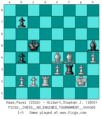 Last move : 1-0 2014 January 10 17:29:31 [Event "FICGS__CHESS__NO_ENGINES_TOURNAMENT__000065"] [Site "FICGS"] [Date "2013.09.01"] [Round "1"] [White "Hase,Pavel"] [Black "Hilbert,Stephan J."] [Result "1-0"] [WhiteElo "2316"] [BlackElo "1800"] 1.e4 d5 2.exd5 Qxd5 3.Nc3 Qa5 4.d4 Nf6 5.Bd2 c6 6.Ne4 Qc7 7.Nxf6+ gxf6 8.g3 Qb6 9.Bc3 Bf5 10.Bg2 Nd7 11.Ne2 O-O-O 12.O-O h5 13.Qd2 Bh6 14.Qd1 Nc5 15.dxc5 Rxd1 16.cxb6 Rxf1+ 17.Bxf1 axb6 18.Nd4 Bd7 19.Bd3 e6 20.h4 Rg8 21.Be2 c5 22.Nb5 e5 23.Rd1 Bf4 24.Kg2 Bc6+ 25.Kh2 Bh6 26.Nd6+ Kc7 27.Bxh5 Ra8 28.a3 Ra4 29.Nf5 Bf8 30.Bxf7 Bf3 31.Rd2 Be4 32.Bb3 Ra8 33.Ne3 b5 34.Bd5 Bg6 35.Ng4 Be7 36.Be6 Bd6 37.Nxf6 e4 38.Nd5+ Kc6 39.Ne3 b4 40.axb4 cxb4 41.Bd5+ Kc7 42.Bf6 Rf8 43.Bg5 Rf3 44.Kg2 Bc5 45.Bf4+ Kb6 46.Be6 Bxe3 47.fxe3 Bh5 48.Bf5 Kc5 49.Bxe4 1-0 Scandinavian (centre counter) defense Queenside Castling by player Black (move 11) Kingside Castling by player White (move 12) Player White won this chess game. Follow this game move after move (download)Later, I began to succeed in decisive games. Perhaps because I realized a very simple truth: not only was I worried, but also my opponent. (Mikhail Tal) Immer nach dem besten Zug zu suchen ist ziemlich unpraktisch. (Nigel Short) Una mala movida nulifica cuarenta buenas. (Horowitz) Karpov est une pièce de musée. (Garry Kasparov) You lose, general Kenobi. (General Grievous in Star Wars ep.3)