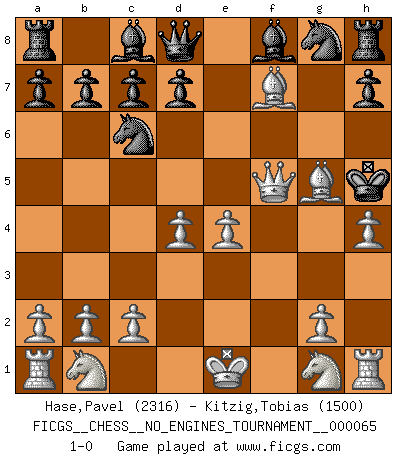Last move : 1-0 2013 September 15 21:5:21 [Event "FICGS__CHESS__NO_ENGINES_TOURNAMENT__000065"] [Site "FICGS"] [Date "2013.09.01"] [Round "1"] [White "Hase,Pavel"] [Black "Kitzig,Tobias"] [Result "1-0"] [WhiteElo "2316"] [BlackElo "1500"] 1.e4 e5 2.f4 f6 3.fxe5 fxe5 4.Qh5+ Ke7 5.Qxe5+ Kf7 6.Bc4+ Kg6 7.Qf5+ Kh6 8.d4 g5 9.h4 Nc6 10.Bxg5+ Kh5 11.Bf7+ 1-0 King's gambit Player White won this chess game. Follow this game move after move (download)What is the difference between chess and football? Everybody understands football, but nobody plays it. Everybody plays chess, but nobody understands it. Everything is relative. (Vladimir Kramnik) Weshalb minderdergeübte Spieler mit g2-g4 beginnen? Die betreffenden sind unschlüssig, ob sie nun rechts (h4) oder links (f4) beginnen sollen, und in ihrer Ratlosigkeit entschliessen sie sich nach guter Bürgerart dazu, den goldenen Mittelweg zu wählen. (Aaron Nimzowitsch) Yo he agregado estos principios a la ley: pongan los Caballos en acción antes de que los dos Alfiles sean desarrollados. (Emanuel Lasker) Aidez vos pièces, elles vous aideront. (Paul Morphy) Programmer - an organism that turns coffee into software. (Anonymous)