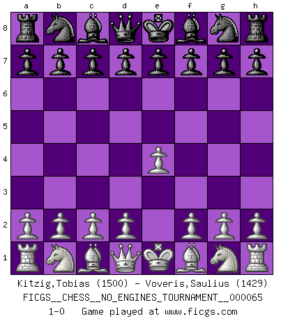 Last move : 1-0 2013 October 11 15:54:36 [Event "FICGS__CHESS__NO_ENGINES_TOURNAMENT__000065"] [Site "FICGS"] [Date "2013.09.01"] [Round "1"] [White "Kitzig,Tobias"] [Black "Voveris,Saulius"] [Result "1-0"] [WhiteElo "1500"] [BlackElo "1429"] 1.e4 1-0 This chess game has been lost on time (started : 2013.09.01 14:57:5) King's pawn Opening Player White won this chess game. Follow this game move after move (download)I'm not a materialistic person, in that, I don't suffer the lack or loss of money. The absence of worldly goods I don't look back on. For Chess is a way I can be as materialistic as I want without having to sell my soul. (Jamie Walter Adams) Ein guter Spieler hat immer Glück. (José Raúl Capablanca) Tu sabes, camarada Pachman, no disfruto el ser un Ministro, preferería jugar al Ajedrez como tu. (Che Guevara) Les écrivains ont utilisé les échecs pour analyser les côtés extrêmes de la nature humaine. Dans ce cadre, les échecs offrent un champ d'expérimentation idéal. Mais on pourrait faire la même chose avec la peinture. Et là, en vous référant à Van Gogh, vous ne tirerez pas de conclusion définitive sur les peintres. (Gary Kasparov) Every man's memory is his private literature. (Aldous Huxley)