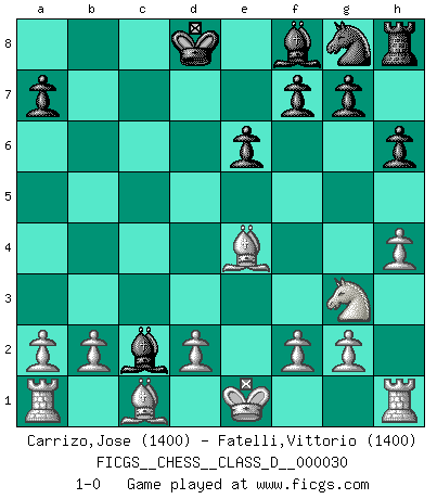 Last move : 1-0 2007 May 10 8:32:11 [Event "FICGS__CHESS__CLASS_D__000030"] [Site "FICGS"] [Date "2007.02.06"] [Round "1"] [White "Carrizo,Jose"] [Black "Fatelli,Vittorio"] [Result "1-0"] [WhiteElo "1400"] [BlackElo "1400"] 1.e4 c6 2.Nf3 d5 3.Nc3 dxe4 4.Nxe4 Bf5 5.Ng3 Bg6 6.h4 h6 7.Ne5 Bh7 8.Qf3 Qd5 9.Qxd5 cxd5 10.Bb5+ Nc6 11.Nxc6 bxc6 12.Bxc6+ Kd8 13.Bxa8 Bxc2 14.Bxd5 e6 15.Be4 1-0 This chess game has been lost on time (started : 2007.02.06 2:52:3) Caro-Kann defense Player White won this chess game. Follow this game move after move (download)Even the laziest King flees wildly in the face of a double check ! (Aaron Nimzowitsch) Oft bringt ein stiller Zug das Erdbeben. (Richard Reti) Botvinnik trató de alejar el misterio referente al Ajedrez, siempre relacionandolo a situaciones de la vida diaria. Solía llamar al Ajedrez un problema inexacto típico, similar a aquellos en que la gente tiene siempre que resolver a cada día. (Garry Kasparov) Je ne suis pas le dernier à jouer lâchement des coups douteux pendant le zeïtnot de l'adversaire pour l'achever: en effet les coups qui font le plus peur sont ceux que l'on ne comprend pas. Je me fais souvent peur quand je joue. (Un professeur anonyme) Life is painting a picture, not doing a sum. (Oliver Wendell Holmes, Jr.)
