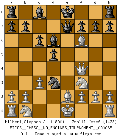 Last move : 0-1 2013 November 28 20:4:40 [Event "FICGS__CHESS__NO_ENGINES_TOURNAMENT__000065"] [Site "FICGS"] [Date "2013.09.01"] [Round "1"] [White "Hilbert,Stephan J."] [Black "Zmolil,Josef"] [Result "0-1"] [WhiteElo "1800"] [BlackElo "1433"] 1.e4 e5 2.d4 exd4 3.c3 d5 4.Qxd4 Nf6 5.Bg5 Nbd7 6.e5 Bc5 7.Qf4 Qe7 8.Nf3 Bd6 9.Bb5 c6 10.Be2 Nxe5 11.Bxf6 Nd3+ 0-1 Danish gambit : Soerensen defense Player Black won this chess game. Follow this game move after move (download)Via the squares on the chessboard, the Indians explain the movement of time and the age, the higher influences which control the world and the ties which link Chess with the human soul. (Al-Masudi) Ein Großmeister muß tausende Partien in seinem Kopf speichern, denn diese sind für Ihn, was die Worte der Muttersprache für gewöhnliche Leute sind, oder Noten für Musiker... (Garry Kasparov) Si el Ajedrez es una ciencia, es la mas inexacta. Si el Ajedrez es un arte, es demasiado inexacto para ser visto como tal. Si el Ajedrez es un deporte, es demasiado esotérico. Si el Ajedrez es un juego, es demasiado exigente para ser solo un juego. Si el Ajedrez es una aventura, es una muy demandante. Si el Ajedrez es una pasión, es una muy gratificante. Si el Ajedrez es la vida, es una muy triste. (Anónimo) Les Echecs représentent une sphère d'idées créatrices basée sur la volonté des deux protagonistes. (Smyslov) Any activity becomes creative when the doer cares about doing it right or doing it better. (John Updike)