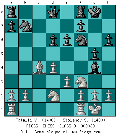 Last move : 0-1 2007 May 12 8:45:0 [Event "FICGS__CHESS__CLASS_D__000030"] [Site "FICGS"] [Date "2007.02.06"] [Round "1"] [White "Fatelli,Vittorio"] [Black "Stoianov,Stoian"] [Result "0-1"] [WhiteElo "1400"] [BlackElo "1400"] 1.d4 d5 2.Bg5 Nc6 3.Nf3 Bg4 4.Nbd2 h6 5.Bf4 Nf6 6.e3 e6 7.c4 dxc4 8.Bxc4 g5 9.Bg3 Bd6 10.Qb3 O-O 11.Bxd6 cxd6 12.O-O Na5 13.Qxb7 Nxb7 0-1 This chess game has been lost on time (started : 2007.02.06 2:52:3) Levitsky attack (Queen's Bishop attack) Kingside Castling by player Black (move 10) Kingside Castling by player White (move 12) Player Black won this chess game. Follow this game move after move (download)Though most people love to look at the games of the great attacking masters, some of the most successful players in history have been the quiet positional players. They slowly grind you down by taking away your space, tying up your pieces, and leaving you with virtually nothing to do ! (Yasser Seirawan) Kein Schachspieler kann gut schlafen. (H. G. Wells) No hay precio que no valga la pena por la cabellera del Rey enemigo. (Koblentz) Le succès, c'est être capable d'aller d'échec en échec sans perdre son enthousiasme. (Winston Churchill) The problem with manipulation is that people can turn on you. (Horatio Caine, C.S.I. Miami)