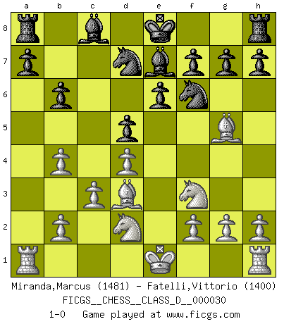 Last move : 1-0 2007 May 15 3:11:3 [Event "FICGS__CHESS__CLASS_D__000030"] [Site "FICGS"] [Date "2007.02.06"] [Round "1"] [White "Miranda,Marcus"] [Black "Fatelli,Vittorio"] [Result "1-0"] [WhiteElo "1481"] [BlackElo "1400"] 1.e4 c6 2.d4 d5 3.exd5 cxd5 4.Bd3 e6 5.c3 Nf6 6.Bg5 Nbd7 7.Nd2 Be7 8.Ngf3 Qb6 9.Qb3 Qxb3 10.axb3 b6 11.b4 1-0 Caro-Kann : Exchange variation Player White won this chess game. Follow this game move after move (download)Dazzling combinations are for the many, shifting wood is for the few. (Georg Kieninger) Ich tröste mich mit dem Vergnügen, daß Schachfans, Zuschauer und Leser glücklich sind, wenn ein Großmeister etwas riskiert, statt nur Klötzchen zu schieben. (Mikhail Nekhemyevich Tal) Solo puedes ser bueno en el Ajedrez si amas al juego. (Bobby Fischer) C'est une question de caractère, Beaucoup de gens perdent leur motivation très vite. D'autres, ils sont rares, peuvent la conserver très longtemps. J'aime les échecs, encore aujourd'hui je suis heureux d'analyser des parties. J'aime toujours gagner, je déteste encore perdre. Bien jouer est important pour mon intégrité intellectuelle et morale. Et puis les échecs vivent en ce moment une période historique grâce à Internet. Ils se développent dans les systèmes éducatifs à travers le monde. Ils sortent de leur ghetto, et c'est mon rôle de mener à bien cette révolution. (Gary Kasparov) Perception is reality. (Immanuel Kant)