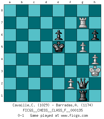 Last move : 0-1 2013 September 10 21:42:6 [Event "FICGS__CHESS__CLASS_F__000135"] [Site "FICGS"] [Date "2013.09.03"] [Round "1"] [White "Cavaille,Cedric"] [Black "Barradas,Anderson"] [Result "0-1"] [WhiteElo "1029"] [BlackElo "1174"] 1.d4 d5 2.Nc3 e6 3.e4 Bb4 4.e5 a6 5.Bd2 Nc6 6.a3 Ba5 7.b4 Bb6 8.Be3 Nge7 9.Nf3 Nf5 10.Qd2 Bd7 11.Be2 h6 12.h4 Nce7 13.Bd3 Bb5 14.Bxb5+ axb5 15.Nxb5 c6 16.Nc3 Ng6 17.g3 Nxe3 18.Qxe3 Ne7 19.Ke2 Nf5 20.Qf4 Ba7 21.a4 b6 22.b5 c5 23.dxc5 bxc5 24.a5 Bb8 25.b6 d4 26.Qe4 Bxe5 27.Qc6+ Kf8 28.Qxc5+ Bd6 29.Qc6 Rc8 30.Qb7 dxc3 31.a6 Rb8 32.a7 Rxb7 33.a8Q Rb8 34.b7 Ke7 35.Rhd1 Qb6 36.Rab1 Qc6 37.g4 Qe4+ 38.Kf1 Ng3+ 39.Kg2 Ne2 40.Rxd6 Kxd6 41.Qa6+ Ke7 42.Qa3+ Kf6 43.Qb4 Qxb4 44.Rxb4 Rhe8 45.Kf1 Nc1 46.Nd4 Red8 47.Nc6 Rd1+ 48.Kg2 Rxb7 49.Rxb7 Rd2 50.Nb4 Rd4 51.Nd3 Nxd3 52.cxd3 Rxd3 53.Rc7 Ke5 54.Rxf7 c2 55.Rxg7 c1Q 56.g5 Qc6+ 57.Kg1 Rd1+ 58.Kh2 Rh1+ 59.Kg3 Rg1+ 60.Kh3 Qg2+ 0-1 Queen's pawn : Chigorin variation Promotion Queen by player White (move 33) 10 pieces endgame at move 55 : White KRPPP , Black KRPPP WHITE : King + 1 Rook 3 Pawns BLACK : King + 1 Rook 3 Pawns Promotion Queen by player Black (move 55) Player Black won this chess game. Follow this game move after move (download)Examine moves that smite! A good eye for smites is far more important than a knowledge of strategical principles. (Purdy) Schach ist ein Teil der Kultur, und wenn es mit der Kultur abwärts geht, geht es auch mit dem Schach abwärts. (Mikhail Moiseyevich Botvinik) Aún el Rey más flojo huye despavorido ante la amenaza de un Jaque doble. (Aaron Nimzowitsch) A chaque perte on perd un peu de soi. (Joël Lautier) If you have any trouble condescending, find a Unix user to show you how it's done. (Scott Adams)