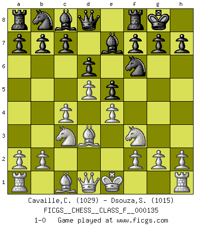 Last move : 1-0 2013 October 14 16:13:24 [Event "FICGS__CHESS__CLASS_F__000135"] [Site "FICGS"] [Date "2013.09.03"] [Round "1"] [White "Cavaille,Cedric"] [Black "Dsouza,Stanislaus"] [Result "1-0"] [WhiteElo "1029"] [BlackElo "1015"] 1.d4 Nf6 2.c4 e6 3.Nc3 Be7 4.Nf3 d6 5.d5 e5 6.e4 O-O 7.Bd3 1-0 This chess game has been lost on time (started : 2013.09.03 18:58:10) Queen's pawn game Kingside Castling by player Black (move 6) Player White won this chess game. Follow this game move after move (download)The defensive power of a pinned piece is only imaginary. (Aaron Nimzovich) Ich bewundere Kasparows phantasievolle Angriffssiege aus den Achtzigern und Neunzigern, aber wenn man sie mit dem Computer überprüft, nimmt der Computer in jeder zweiten Partie die Opfer an, verteidigt sich und gewinnt. (Vladimir Kramnik) Un entendimiento a fondo de las continuaciones típicas del mate, hace de las combinaciones de sacrificio mas complicadas conducirlas a ellas no solo sin dificultad, sino casi de una manera natural. (Siegbert Tarrasch) Je ne suis pas le dernier à jouer lâchement des coups douteux pendant le zeïtnot de l'adversaire pour l'achever: en effet les coups qui font le plus peur sont ceux que l'on ne comprend pas. Je me fais souvent peur quand je joue. (Un professeur anonyme) Life is like a play: it's not the length but the excellence of the acting that matters. (Seneca)