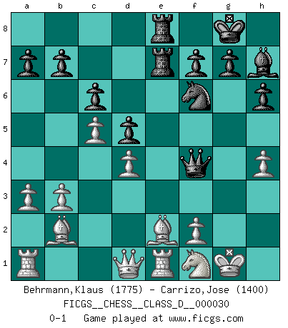 Last move : 0-1 2007 March 4 11:25:47 [Event "FICGS__CHESS__CLASS_D__000030"] [Site "FICGS"] [Date "2007.02.06"] [Round "1"] [White "Behrmann,Klaus"] [Black "Carrizo,Jose"] [Result "0-1"] [WhiteElo "1775"] [BlackElo "1400"] 1.b3 d5 2.Bb2 Nf6 3.e3 Bf5 4.Nf3 e6 5.Be2 h6 6.O-O Nbd7 7.d3 Bd6 8.Nc3 c6 9.e4 Bh7 10.exd5 exd5 11.Re1 O-O 12.a3 Re8 13.Nb1 Qc7 14.Nbd2 Re7 15.Nf1 Rae8 16.c4 Ne5 17.Nxe5 Bxe5 18.d4 Bd6 19.c5 Bf4 20.g3 Bg5 21.h4 Bxh4 22.gxh4 Qf4 0-1 Nimzovich-Larsen attack : Classical variation Kingside Castling by player White (move 6) Kingside Castling by player Black (move 11) Player Black won this chess game. Follow this game move after move (download)Not all artists are Chess players, but all Chess players are artists. (Marcel Duchamp) Lisa Lane, amerikanische Schachmeisterin, hatte Fischer einmal als stärksten lebenden Spieler bezeichnet. Antwort: Das ist richtig, aber Lisa Lane ist eigentlich nicht in der Lage, das zu beurteilen. (Robert James Fischer) Repentinamente, me resultaba obvio en mi analisis que yo había pasado por alto lo que Fischer había visto en el tablero con la mas grande facilidad. (Mikhail Botvinnik) Aidez vos pièces, elles vous aideront. (Paul Morphy) If you work for a living, why do you kill yourself working ? (Tuco to a chicken in The Good, The Bad and The Ugly)