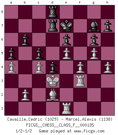 Last move : 1/2-1/2 2013 September 15 15:28:22 [Event "FICGS__CHESS__CLASS_F__000135"] [Site "FICGS"] [Date "2013.09.03"] [Round "1"] [White "Cavaille,Cedric"] [Black "Marcel,Alexis"] [Result "1/2-1/2"] [WhiteElo "1029"] [BlackElo "1138"] 1.d4 f5 2.f4 Nf6 3.Nc3 g6 4.Qd3 Bg7 5.Bd2 O-O 6.O-O-O d6 7.e4 Nxe4 8.Nxe4 fxe4 9.Qxe4 d5 10.Qe3 Nc6 11.Bc3 Bg4 12.Rd2 Bh6 13.g3 Re8 14.Be2 Bxe2 15.Rxe2 Qd6 16.Nf3 a6 17.Qe6+ Qxe6 18.Rxe6 Bg7 19.Rhe1 a5 20.a4 Bf6 21.R6e3 Kf7 22.Ne5+ Nxe5 23.dxe5 Bg7 24.g4 b6 25.g5 e6 26.h4 c5 27.Bd2 d4 28.Rf3 Red8 29.c4 Rd7 30.Kc2 Rad8 31.Kd3 Ke7 1/2-1/2 Dutch Kingside Castling by player Black (move 5) Queenside Castling by player White (move 6) This chess game ended in a draw. Follow this game move after move (download)I had a toothache during the first game. In the second game I had a headache. In the third game it was an attack of rheumatism. In the fourth game, I wasn't feeling well. And in the fifth game? Well, must one have to win every game ? (Siegbert Tarrasch) Deine Wertungszahl - vorausgesetzt einige Jahre schachliche Anstrengung - entspricht etwa dem zehnfachen Deines IQ plus 1000. (Jonathan Levitt) Hoy en día, si tu no eres un Gran Maestro a los 14 años, es mejor que lo olvides. (Anand Viswanathan) C'est une question de caractère, Beaucoup de gens perdent leur motivation très vite. D'autres, ils sont rares, peuvent la conserver très longtemps. J'aime les échecs, encore aujourd'hui je suis heureux d'analyser des parties. J'aime toujours gagner, je déteste encore perdre. Bien jouer est important pour mon intégrité intellectuelle et morale. Et puis les échecs vivent en ce moment une période historique grâce à Internet. Ils se développent dans les systèmes éducatifs à travers le monde. Ils sortent de leur ghetto, et c'est mon rôle de mener à bien cette révolution. (Gary Kasparov) There's no money in correspondence chess. (John Knudsen)