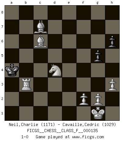 Last move : 1-0 2013 October 4 19:29:6 [Event "FICGS__CHESS__CLASS_F__000135"] [Site "FICGS"] [Date "2013.09.03"] [Round "1"] [White "Neil,Charlie"] [Black "Cavaille,Cedric"] [Result "1-0"] [WhiteElo "1171"] [BlackElo "1029"] 1.d4 d5 2.c4 dxc4 3.Nc3 Bd7 4.e4 b5 5.Bf4 c6 6.Nf3 Bg4 7.Be2 e6 8.h3 Bd6 9.e5 Bxf3 10.Bxf3 Be7 11.Qd2 a5 12.O-O f6 13.exf6 Bxf6 14.Rfe1 Qd7 15.Bg4 Ne7 16.Rxe6 O-O 17.Rxf6 Nf5 18.Rxf8+ Kxf8 19.Re1 Qxd4 20.Bxf5 Qxd2 21.Bxd2 Na6 22.Bf4 b4 23.Bd6+ Kg8 24.Na4 Rd8 25.Be6+ Kh8 26.Bxc4 h6 27.Bg3 Kh7 28.Bxa6 Kg6 29.Nc5 Kf5 30.Bd3+ Kf6 31.Ne4+ Ke6 32.Ng5+ Kd5 33.Nf3 c5 34.Rd1 Kc6 35.Be4+ Kb5 36.Rxd8 a4 37.b3 axb3 38.axb3 c4 39.Nd4+ Kc5 40.Ne6+ Kb5 41.Rb8+ Ka6 42.Rxb4 cxb3 43.Rxb3 Ka5 44.Bc7+ Ka4 45.Nd4 g5 46.Bc6+ 1-0 Queen's gambit accepted Kingside Castling by player White (move 12) Kingside Castling by player Black (move 16) Player White won this chess game. Follow this game move after move (download)Fischer is under obligation to nobody. (Joseph Platz) Ein bischen Romantik kann weder im Schach noch in der Liebe schaden. Also versuche ich mich ab und zu daran zu erinnern. (Nigel Short) Alekhine es un poeta que crea un trabajo de arte de algo que raramente inspiraría a otra persona a mandar una tarjeta postal. (Max Euwe) Si je n'étais pas joueur d'échecs, je serais le meilleur dans quelque chose d'autre. (Anatoli Karpov) Good luck. You're gonna need it. (Han Solo in Star Wars ep.6)