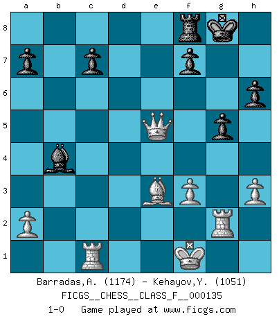 Last move : 1-0 2013 September 18 20:31:52 [Event "FICGS__CHESS__CLASS_F__000135"] [Site "FICGS"] [Date "2013.09.03"] [Round "1"] [White "Barradas,Anderson"] [Black "Kehayov,Yulian"] [Result "1-0"] [WhiteElo "1174"] [BlackElo "1051"] 1.e4 e5 2.Nf3 d6 3.h3 Nf6 4.d3 Be7 5.Nc3 h6 6.Be3 O-O 7.Be2 Be6 8.d4 exd4 9.Nxd4 d5 10.exd5 Nxd5 11.Nxd5 Qxd5 12.Bf3 Qd8 13.Bxb7 Nc6 14.Bxa8 Nxd4 15.Bxd4 Qxa8 16.Qf3 Bd5 17.Qg3 Bxg2 18.Rg1 Qe4+ 19.Be3 g5 20.Rxg2 Qxc2 21.Rc1 Bb4+ 22.Kf1 Qxb2 23.f3 Qe5 24.Qxe5 1-0 Philidor's defense Kingside Castling by player Black (move 6) Player White won this chess game. Follow this game move after move (download)Chess is a part of culture and if a culture is declining then Chess too will decline. (Mikhail Botvinnik) Das Schachspiel hat wie die Liebe, die Musik, die Fähigkeit, den Menschen glücklich zu machen. Ich habe ein leises Gefühl des Bedauerns für jeden, der das Schachspiel nicht kennt, so wie ich jeden bedaure, der die Liebe nicht kennt. (Siegbert Tarrasch) Coloca el contenido del tablero de Ajedrez en un sombrero, agita las piezas vigorosamente, derrámalas en el tablero desde una altura de medio metro y así obtienes el estilo de Wilhelm Steinitz. (H. E. Bird) J'apprécie les joueurs d'est-indienne, c'est grâce à eux que je nourris ma famille depuis tant d'années. (Petrosian) Never was anything great achieved without danger. (Niccolo Machiavelli)