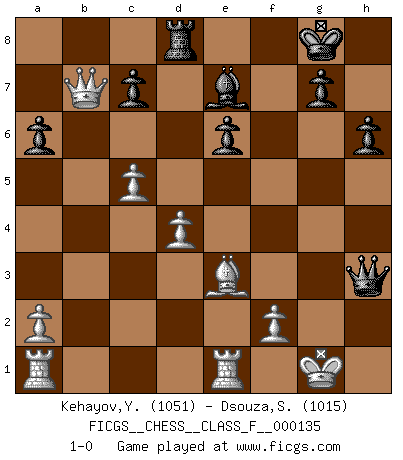 Last move : 1-0 2014 January 10 22:47:7 [Event "FICGS__CHESS__CLASS_F__000135"] [Site "FICGS"] [Date "2013.09.03"] [Round "1"] [White "Kehayov,Yulian"] [Black "Dsouza,Stanislaus"] [Result "1-0"] [WhiteElo "1051"] [BlackElo "1015"] 1.d3 d5 2.e3 Nc6 3.Nf3 e5 4.Be2 Bd6 5.O-O Be6 6.h3 Nf6 7.Nc3 d4 8.exd4 exd4 9.Nb1 Nd5 10.c3 dxc3 11.Nxc3 Nxc3 12.bxc3 O-O 13.Bg5 Qe8 14.d4 Bd7 15.Bb5 a6 16.Bc4 h6 17.Be3 Be6 18.Bxe6 fxe6 19.Re1 Rd8 20.Qd3 Qh5 21.c4 Nb4 22.Qc3 Rxf3 23.gxf3 Qxf3 24.c5 Be7 25.Qxb4 Qxh3 26.Qxb7 1-0 Mieses Opening Kingside Castling by player White (move 5) Kingside Castling by player Black (move 12) Player White won this chess game. Follow this game move after move (download)Avoid the crowd. Do your own thinking independently. Be the Chess player, not the Chess piece. (Ralph Charell) Die meiste Zeit treffe ich auf Gegner, die meine Enkel sein könnten. Ich bin da, um ihnen zu zeigen, dass sie von mir noch einiges lernen können. (Viktor Kortschnoi) Algunos sacrificios son sólidos, los demás son míos. (Mikhail Tal) Les échecs c'est le défi de l'alpiniste, toujours plus haut, prêt à tout pour monter à l'assaut du Roi ennemi. Les échecs, c'est de la musique en mouvement, un ballet majestueux pour les yeux. C'est de la poésie composée par les fantômes du passé qui au même titre que Rimbaud ou Verlaine méritent notre admiration. Les échecs, c'est de la peinture ou le moindre mouvement modifie le tableau pour en faire un Picasso ou un Van Gogh. Les échecs, c'est tout et rien, c'est la vie et la mort. Jjulie33 sur le forum de France-Echecs. When you don't know what to do, walk fast and look worried. (Anonymous)