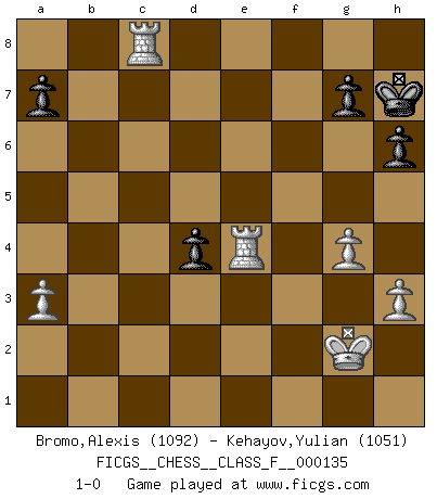 Last move : 1-0 2013 September 28 12:1:51 [Event "FICGS__CHESS__CLASS_F__000135"] [Site "FICGS"] [Date "2013.09.03"] [Round "1"] [White "Bromo,Alexis"] [Black "Kehayov,Yulian"] [Result "1-0"] [WhiteElo "1092"] [BlackElo "1051"] 1.d4 d6 2.c4 e6 3.Nc3 h6 4.Nf3 Nf6 5.e3 Be7 6.b4 O-O 7.Bb2 Nc6 8.a3 Re8 9.Bd3 d5 10.c5 b6 11.Bb5 Bb7 12.Ne5 Nxe5 13.Bxe8 Qxe8 14.dxe5 Nd7 15.Ne2 c6 16.Bd4 f6 17.exf6 Bxf6 18.Bxf6 Nxf6 19.h3 bxc5 20.bxc5 Nd7 21.Nf4 Nxc5 22.O-O Ne4 23.Qc2 e5 24.Nd3 Ba6 25.Rfe1 Bxd3 26.Qxd3 Nc5 27.Qf5 e4 28.f3 exf3 29.Qxf3 Qe4 30.Qxe4 Nxe4 31.Rac1 Rc8 32.g4 c5 33.Kg2 d4 34.exd4 cxd4 35.Rxc8+ Kh7 36.Rxe4 1-0 Old Indian defense Kingside Castling by player Black (move 6) Kingside Castling by player White (move 22) Player White won this chess game. Follow this game move after move (download)Fischer is an American Chess tragedy on par with Morphy and Pillsbury. (Mig Greengard) Was ist der Unterschied zwischen einem Strassenarbeiter und einem Schachspieler? --Der Schachspieler bewegt sich ab und zu. (Anonymous) La belleza de un movimiento no se refleja solo en su apariencia, sino en el pensamiento detrás de él. (Siegbert Tarrasch) RxDa4 pat (...) All the biggest technological inventions created by man - the airplane, the automobile, the computer - says little about his intelligence, but speaks volumes about his laziness. (Mark Kennedy)