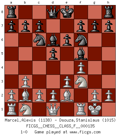 Last move : 1-0 2013 October 15 4:14:21 [Event "FICGS__CHESS__CLASS_F__000135"] [Site "FICGS"] [Date "2013.09.03"] [Round "1"] [White "Marcel,Alexis"] [Black "Dsouza,Stanislaus"] [Result "1-0"] [WhiteElo "1138"] [BlackElo "1015"] 1.f4 d5 2.Nf3 Bf5 3.e3 e6 4.Be2 Bd6 5.b3 Nc6 6.Bb2 Nf6 7.O-O 1-0 This chess game has been lost on time (started : 2013.09.03 18:58:10) Bird's Opening Kingside Castling by player White (move 7) Player White won this chess game. Follow this game move after move (download)It is always better to sacrifice your opponent's men. (Savielly Tartakower) Obwohl ich alt bin, darf mir niemand den Finger in den Mund stecken, sonst beisse ich. (Wilhelm Steinitz) Aquel que toma al Peón de Caballo de la Reina, se pasará la noche a dormir en la calle. (Anónimo) Même un GMI sait rarement calculer sur plus de cinq coups une attaque à sacrifices. (Rudolf Spielmann) There is a great deal of difference between an eager man who wants to read a book and a tired man who wants a book to read. (G.K. Chesterton)