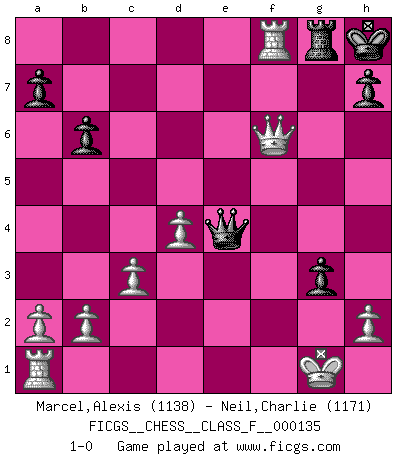 Last move : 1-0 2013 October 9 23:5:57 [Event "FICGS__CHESS__CLASS_F__000135"] [Site "FICGS"] [Date "2013.09.03"] [Round "1"] [White "Marcel,Alexis"] [Black "Neil,Charlie"] [Result "1-0"] [WhiteElo "1138"] [BlackElo "1171"] 1.f4 e5 2.fxe5 d6 3.exd6 Bxd6 4.Nf3 Bg4 5.g3 Nh6 6.e4 Nc6 7.c3 Qe7 8.Qe2 Ne5 9.Bg2 Qf6 10.O-O Bxf3 11.Bxf3 O-O 12.Bh5 Qe7 13.d4 Nc6 14.Bxh6 gxh6 15.e5 Rae8 16.Qg4+ Kh8 17.exd6 Qe3+ 18.Kg2 Rg8 19.Qd1 Qe4+ 20.Bf3 Qg6 21.Nd2 cxd6 22.Qb3 b6 23.Bxc6 Re2+ 24.Rf2 Re3 25.Be4 Rxe4 26.Nxe4 Qxe4+ 27.Kg1 h5 28.Qxf7 h4 29.Qf6+ Rg7 30.Qxd6 hxg3 31.Rf8+ Rg8 32.Qf6+ 1-0 Bird : From gambit Kingside Castling by player White (move 10) Kingside Castling by player Black (move 11) Player White won this chess game. Follow this game move after move (download)I have never in my life played the French Defence, which is the dullest of all openings. (Wilhelm Steinitz) Im Schach gibt es keinen Platz für Galanterie. (Irving Chernev) Durante una competencia de Ajedrez, un Maestro de Ajedrez deberá ser una combinación de presa de caza y un Monge. (Alexander Alekhine) Nous sommes les pions de la mystérieuse partie d'Echecs jouée par Dieu. Il nous déplace, nous arrête, nous pousse encore, puis nous lance un à un dans la boîte du Néant. Epitaphe sur la tombe de David Janowsky (1868-1927). Don't anthropomorphize computers - they hate it. (Anonymous)