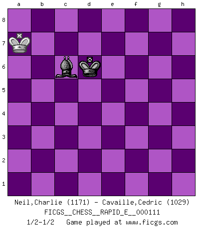 Last move : 1/2-1/2 2013 October 19 21:31:45 [Event "FICGS__CHESS__RAPID_E__000111"] [Site "FICGS"] [Date "2013.09.03"] [Round "1"] [White "Neil,Charlie"] [Black "Cavaille,Cedric"] [Result "1/2-1/2"] [WhiteElo "1171"] [BlackElo "1029"] 1.c4 c5 2.Nc3 d6 3.g3 Nc6 4.Bg2 Bd7 5.e4 e5 6.d3 Nd4 7.Be3 Bc6 8.Nge2 Nf6 9.h3 Qb6 10.b3 a5 11.O-O Qa6 12.f4 Nxe2+ 13.Nxe2 exf4 14.Bxf4 b5 15.Nc3 b4 16.Nd5 Nxd5 17.exd5 Bd7 18.d4 cxd4 19.Qxd4 Qa7 20.Rae1+ Be7 21.Qxa7 Rxa7 22.Bxd6 Bc8 23.Bc5 Rc7 24.Bxe7 Rxe7 25.Rxe7+ Kxe7 26.g4 g5 27.Re1+ Kd7 28.Kf2 Re8 29.Rxe8 Kxe8 30.Ke3 f5 31.gxf5 Bxf5 32.Kd2 Ke7 33.c5 h5 34.Ke3 Bb1 35.Kd2 g4 36.hxg4 hxg4 37.Kc1 Bg6 38.Kb2 Be8 39.a3 Kf6 40.axb4 axb4 41.Kc2 Bg6+ 42.Kd2 Ke5 43.c6 Kd6 44.Bh1 Bf5 45.Bg2 Bg6 46.Ke3 Bc2 47.Kd4 Bxb3 48.Be4 Ba4 49.Kc4 b3 50.Kb4 g3 51.Ka3 Bb5 52.Kxb3 Bf1 53.Kb4 g2 54.Bxg2 Bxg2 55.Kb5 Bxd5 56.Kb6 Bxc6 57.Ka7 1/2-1/2 English : Symmetrical variation Kingside Castling by player White (move 11) 10 pieces endgame at move 40 : White KBPPPP , Black KBPP WHITE : King + 1 Bishop 4 Pawns BLACK : King + 1 Bishop 2 Pawns 9 pieces endgame at move 40 : White KBPPP , Black KBPP WHITE : King + 1 Bishop 3 Pawns BLACK : King + 1 Bishop 2 Pawns 8 pieces endgame at move 47 : White KBPP , Black KBPP WHITE : King + 1 Bishop 2 Pawns BLACK : King + 1 Bishop 2 Pawns 7 pieces endgame at move 52 : White KBPP , Black KBP WHITE : King + 1 Bishop 2 Pawns BLACK : King + 1 Bishop 1 Pawn 6 pieces endgame at move 54 : White KBPP , Black KB WHITE : King + 1 Bishop 2 Pawns BLACK : King + 1 Bishop 5 pieces endgame at move 54 : White KPP , Black KB WHITE : King + 2 Pawns BLACK : King + 1 Bishop 4 pieces endgame at move 55 : White KP , Black KB WHITE : King + 1 Pawn BLACK : King + 1 Bishop 3 pieces endgame at move 56 : White K , Black KB WHITE : King + BLACK : King + 1 Bishop This chess game ended in a draw. Follow this game move after move (download)My opponents make good moves too. Sometimes I don't take these things into consideration. (Bobby Fischer) Ich las kürzlich ein Buch von Nietzsche. Er sagte Religion verdumme nur die Menschen. Ich stimme zu. (Robert James Fischer) Algunos sacrificios son sólidos, los demás son míos. (Mikhail Tal) J'apprécie les joueurs d'est-indienne, c'est grâce à eux que je nourris ma famille depuis tant d'années. (Petrosian) Luck is the residue of design. (John Milton)
