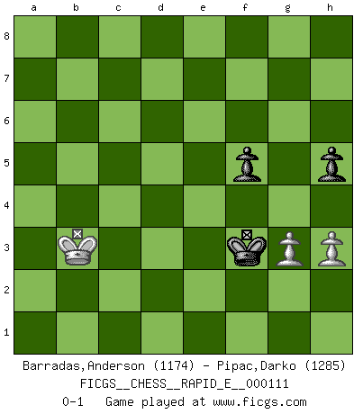 Last move : 0-1 2013 October 10 22:58:29 [Event "FICGS__CHESS__RAPID_E__000111"] [Site "FICGS"] [Date "2013.09.03"] [Round "1"] [White "Barradas,Anderson"] [Black "Pipac,Darko"] [Result "0-1"] [WhiteElo "1174"] [BlackElo "1285"] 1.e4 e5 2.Nf3 Nc6 3.Bb5 d6 4.h3 Bd7 5.c3 a6 6.Bxc6 Bxc6 7.d3 h6 8.O-O Nf6 9.Nbd2 Qe7 10.Nb3 d5 11.exd5 Bxd5 12.c4 Bxf3 13.Qxf3 O-O-O 14.Re1 e4 15.dxe4 Qb4 16.Qc3 Qxc3 17.bxc3 g5 18.e5 Re8 19.Bb2 Nd7 20.e6 Rxe6 21.c5 Rxe1+ 22.Rxe1 Bxc5 23.Nxc5 Nxc5 24.Re3 Rd8 25.Re7 Rd7 26.Re3 f5 27.Re5 Nd3 28.Re8+ Rd8 29.Rxd8+ Kxd8 30.Ba1 Kd7 31.Kf1 Kd6 32.g3 c5 33.c4 b5 34.cxb5 axb5 35.Bg7 h5 36.Ke2 Nc1+ 37.Ke3 Nxa2 38.f4 gxf4+ 39.Kxf4 c4 40.Ke3 Kd5 41.Bd4 b4 42.Bf6 c3 43.Kd3 b3 44.Bxc3 Nxc3 45.Kxc3 Ke4 46.Kxb3 Kf3 0-1 Ruy Lopez : Old Steinitz defense Kingside Castling by player White (move 8) Queenside Castling by player Black (move 13) 10 pieces endgame at move 39 : White KBPP , Black KNPPPP WHITE : King + 1 Bishop 2 Pawns BLACK : King + 1 Knight 4 Pawns 9 pieces endgame at move 44 : White KBPP , Black KNPPP WHITE : King + 1 Bishop 2 Pawns BLACK : King + 1 Knight 3 Pawns 8 pieces endgame at move 44 : White KPP , Black KNPPP WHITE : King + 2 Pawns BLACK : King + 1 Knight 3 Pawns 7 pieces endgame at move 45 : White KPP , Black KPPP WHITE : King + 2 Pawns BLACK : King + 3 Pawns 6 pieces endgame at move 46 : White KPP , Black KPP WHITE : King + 2 Pawns BLACK : King + 2 Pawns Player Black won this chess game. Follow this game move after move (download)Weak points or holes in the opponent's position must be occupied by pieces not Pawns. (Siegbert Tarrasch) Zu meiner Zeit war ein 20 jähriger ein junger Spieler, heute ist er ein Veteran. (Garry Kasparov) Si pudieramos observar el interior de la cabeza de un jugador de Ajedrez, encontraríamos ahí un mundo lleno de sentimientos, imágenes, ideas, emoción y pasión. (Alfred Binet) Le thème de l'attaque double intervient d'une manière ou d'une autre dans l'immense majorité des combinaisons. (Youri Averbakh) When it is a question of money, everybody is of the same religion. (Voltaire)
