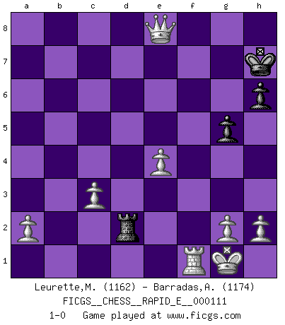 Last move : 1-0 2013 October 9 21:53:41 [Event "FICGS__CHESS__RAPID_E__000111"] [Site "FICGS"] [Date "2013.09.03"] [Round "1"] [White "Leurette,Marc-Antoine"] [Black "Barradas,Anderson"] [Result "1-0"] [WhiteElo "1162"] [BlackElo "1174"] 1.e4 c5 2.c3 e5 3.Nf3 d6 4.Bb5+ Bd7 5.Bxd7+ Nxd7 6.d3 h6 7.O-O Ngf6 8.Be3 a6 9.Nbd2 b5 10.d4 Nb6 11.dxe5 dxe5 12.Nxe5 Bd6 13.f4 Bxe5 14.fxe5 Nfd7 15.Bf4 O-O 16.b3 c4 17.bxc4 Nxc4 18.Nxc4 bxc4 19.Qg4 g5 20.Be3 Nxe5 21.Qh5 Kh7 22.Bd4 Qe7 23.Bxe5 Qxe5 24.Rxf7+ Rxf7 25.Qxf7+ Kh8 26.Qxc4 Rd8 27.Rf1 Qe8 28.Qxa6 Kh7 29.Qb7+ Rd7 30.Qc6 Rd2 31.Qxe8 1-0 Sicilian : Alapin's variation (2.c3) Kingside Castling by player White (move 7) Kingside Castling by player Black (move 15) Player White won this chess game. Follow this game move after move (download)It began to feel as though you were playing against Chess itself. - On playing against Robert Fischer. (Walter Shipman) Ein typischer, sehr verbreiteter Gedankenschädling ist der, daß der betreffende Amateur von der Annanhme ausgeht, daß jeder einzelne Zug etwas zu leisten habe. (Aaron Nimzowitsch) El Ajedrez es un cuento de Hadas de las 1001 metidas de pata. (Savielly Tartakower) Des idées, des idées, j'en ai cent, j'en ai mille. Des bonnes, des mauvaises, applicables, irréalisables... Il suffit de faire le tri ! (Roos) Whatever you do, don't be bored. This is absolutely the most exciting time we could have possibly hoped to be alive. And things are just starting. (From movie Waking life)
