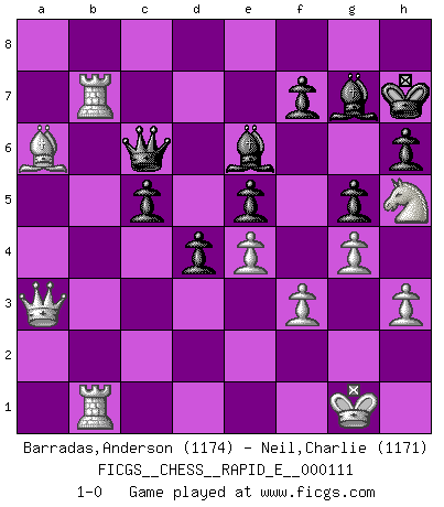 Last move : 1-0 2013 October 9 23:7:23 [Event "FICGS__CHESS__RAPID_E__000111"] [Site "FICGS"] [Date "2013.09.03"] [Round "1"] [White "Barradas,Anderson"] [Black "Neil,Charlie"] [Result "1-0"] [WhiteElo "1174"] [BlackElo "1171"] 1.e4 c5 2.Nf3 Nc6 3.d4 cxd4 4.Nxd4 Nf6 5.Nc3 e6 6.Nxc6 bxc6 7.Bg5 Bb4 8.Bd3 e5 9.O-O O-O 10.Ne2 h6 11.Bh4 Be7 12.a3 d6 13.h3 Bb7 14.b4 Rc8 15.c4 d5 16.Bxf6 Bxf6 17.Ng3 d4 18.c5 Ra8 19.Nh5 Bc8 20.g4 g5 21.Qf3 Bh8 22.a4 Qe7 23.Rfc1 Be6 24.b5 Rfc8 25.Ng3 Bg7 26.Nh5 Bh8 27.b6 axb6 28.cxb6 Rcb8 29.a5 Qb7 30.Rcb1 Bg7 31.a6 Rxa6 32.Bxa6 Qe7 33.b7 Kh7 34.Rb6 c5 35.Qa3 Qc7 36.Rab1 Rxb7 37.Rxb7 Qc6 38.f3 1-0 Sicilian defense Kingside Castling by player White (move 9) Kingside Castling by player Black (move 9) Player White won this chess game. Follow this game move after move (download)Chess is mental torture. (Garry Kasparov) Stelle das Brett so, daß die Sonne in die Augen deines Gegners scheint. (Ruy López) Yo tuve un dolor de muelas en la primer partida. En el segundo juego, tuve un dolor de cabeza. En el tercero, tuve un ataque de reumatísmo. En la cuarta partida, no me sentía muy bien. ¿Y en el quinto juego? Bueno, ¿que acaso uno tiene que ganar todos los juegos?. (Siegbert Tarrasch) D'abord les bases : Jouez et étudiez, puis étudiez et jouez, ensuite jouez et étudiez, puis étudiez et jouez. Deuxièmement : Donnez toujours le meilleur de vous-même ! (Ken Smith) Computers are like Old Testament gods; lots of rules and no mercy. (Joseph Campbell)