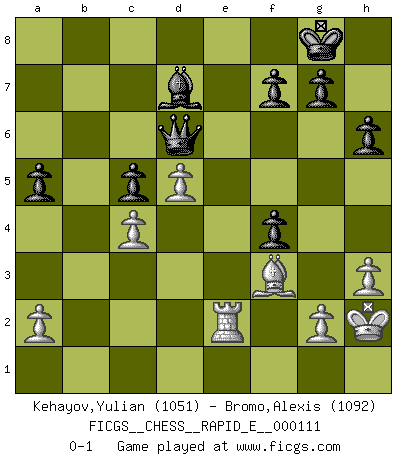 Last move : 0-1 2013 September 28 11:38:7 [Event "FICGS__CHESS__RAPID_E__000111"] [Site "FICGS"] [Date "2013.09.03"] [Round "1"] [White "Kehayov,Yulian"] [Black "Bromo,Alexis"] [Result "0-1"] [WhiteElo "1051"] [BlackElo "1092"] 1.e4 e5 2.Nf3 d6 3.Be2 Nc6 4.O-O h6 5.d4 Nf6 6.h3 Be7 7.d5 Nd4 8.Nxd4 exd4 9.Qxd4 O-O 10.c4 b6 11.Nc3 Bb7 12.b3 c5 13.Qe3 a6 14.Bb2 Re8 15.e5 dxe5 16.Ne4 Nxe4 17.Qxe4 Bf6 18.f4 exf4 19.Bxf6 Qxf6 20.Bd3 Rxe4 21.Bxe4 Re8 22.Bf3 Qd6 23.Rad1 b5 24.Kh1 bxc4 25.bxc4 Re3 26.Rfe1 Rxe1+ 27.Rxe1 Bc8 28.Kh2 Bd7 29.Re2 a5 0-1 Philidor's defense Kingside Castling by player White (move 4) Kingside Castling by player Black (move 9) Player Black won this chess game. Follow this game move after move (download)Castle early and often. (Rob Sillars) Ivan Sokolov treibt mich als Beifahrer an mit go Loeky go - . (Loek van Wely) Un entendimiento minucioso de las típicas continuaciones de mate hacen de las mas complicadas combinaciones de sacrificio que conducen hacia ellas no solo no dificiles, sino casi un asunto de rutina. (Siegbert Tarrasch) Les Echecs sont affaire de jugement sensible. Savoir quand frapper et quand esquiver. (Fischer) Pushing plastic is for the many, pushing virtual pieces is for the fewer, pushing wood is for the very few. (Normajean Yates)