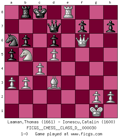 Last move : 1-0 2007 September 8 14:15:44 [Event "FICGS__CHESS__CLASS_D__000030"] [Site "FICGS"] [Date "2007.02.06"] [Round "1"] [White "Laaman,Thomas"] [Black "Ionescu,Catalin"] [Result "1-0"] [WhiteElo "1661"] [BlackElo "1600"] 1.e4 c5 2.Nf3 d6 3.d4 cxd4 4.Nxd4 Nc6 5.c4 e5 6.Nc2 Nf6 7.Nc3 Be6 8.Be2 Be7 9.O-O O-O 10.Be3 b6 11.b3 Qd7 12.f4 exf4 13.Bxf4 a5 14.Ne3 Qc8 15.Ned5 Bxd5 16.exd5 Nb4 17.Be3 Bd8 18.Nb5 Qd7 19.Bd4 Re8 20.a3 Na6 21.Bd3 Rb8 22.Bxf6 Bxf6 23.Rxf6 gxf6 24.Qh5 Kf8 25.Qh6+ Ke7 26.Re1+ Kd8 27.Qxf6+ Kc8 28.Rxe8+ 1-0 Sicilian Kingside Castling by player White (move 9) Kingside Castling by player Black (move 9) Player White won this chess game. Follow this game move after move (download)I like to say that Bobby Fischer was the greatest player ever. But what made Fischer a genius was his ability to blend an American freshness and pragmatism with Russian ideas about strategy. (Bruce Pandolfini) Kann Schach nicht schließlich das Nationalspiel der Deutschen werden? Und welche weiteren Ausblicke bieten sich dann dar! Welche Hebung des allgemeinen Kultur-Niveaus, ja der Moral, wenn das Schachbrett den Kartentisch verdrängen würde! Wahrlich, ein Ziel, des Schweißes der Edlen wert! (Siegbert Tarrasch) No es una movida, aún la mejor movida que tu debas buscar, sino un plan comprensible. (Eugene Znosko-Borovsky) Il s'avisa de me proposer d'apprendre les échecs qu'il jouait un peu... me voilà forcené des échecs. J'achète un échiquier, je m'enferme dans ma chambre, j'y passe des jours et des nuits à vouloir apprendre par cur toutes les parties. (Jean-Jacques Rousseau, Confessions) Be who you are, and say what you feel because those who mind don't matter, and those who matter don't mind. (Dr Seuss)