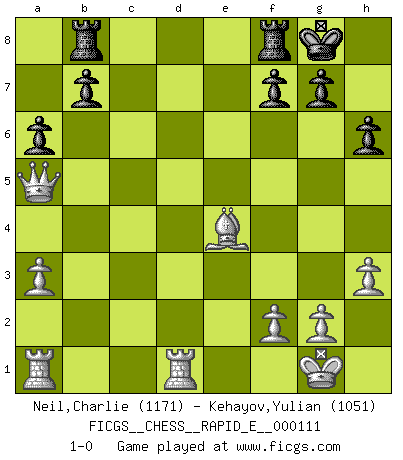 Last move : 1-0 2013 October 12 23:52:31 [Event "FICGS__CHESS__RAPID_E__000111"] [Site "FICGS"] [Date "2013.09.03"] [Round "1"] [White "Neil,Charlie"] [Black "Kehayov,Yulian"] [Result "1-0"] [WhiteElo "1171"] [BlackElo "1051"] 1.Nf3 d5 2.d4 Nc6 3.c4 e6 4.Nc3 Nf6 5.Bg5 h6 6.Bxf6 Qxf6 7.cxd5 exd5 8.e3 Bb4 9.Be2 O-O 10.O-O Ne7 11.a3 Bxc3 12.bxc3 Bg4 13.h3 Bxf3 14.Bxf3 c6 15.Qb3 Rab8 16.c4 dxc4 17.Qxc4 Qf5 18.e4 Qd7 19.Rfd1 Qc7 20.d5 cxd5 21.Qxc7 Nc6 22.Qf4 dxe4 23.Bxe4 Na5 24.Qc7 a6 25.Qxa5 1-0 Reti Opening Kingside Castling by player Black (move 9) Kingside Castling by player White (move 10) Player White won this chess game. Follow this game move after move (download)Modern Chess is too much concerned with things like Pawn structure. Forget it, Checkmate ends the game. (Nigel Short) Man gibt nur Pakete auf. (Paul Keres) Una buena ofensiva y una buena defensa, comienzan ambas con un buen desarrollo. (Bruce A. Moon) Ce qui caractérise les parties de combat, c'est que si le défenseur a constamment de difficiles problèmes à résoudre, l'attaquant doit chercher sans relâche de nouvelles possibilités d'attaque. (Koblentz) Employ the attack like tactic of defense. (Chinese proverb)
