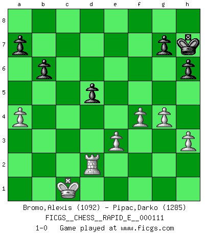Last move : 1-0 2013 October 5 14:6:41 [Event "FICGS__CHESS__RAPID_E__000111"] [Site "FICGS"] [Date "2013.09.03"] [Round "1"] [White "Bromo,Alexis"] [Black "Pipac,Darko"] [Result "1-0"] [WhiteElo "1092"] [BlackElo "1285"] 1.d4 d5 2.c4 c6 3.Nc3 Nd7 4.Nf3 h6 5.e3 f6 6.h3 e5 7.dxe5 fxe5 8.cxd5 Bb4 9.a3 Bxc3+ 10.bxc3 Nc5 11.Nxe5 Qxd5 12.Qh5+ Kf8 13.c4 Nf6 14.Ng6+ Kg8 15.Ne7+ Kf8 16.Qxd5 Nxd5 17.Ng6+ Kg8 18.Nxh8 Kxh8 19.cxd5 cxd5 20.a4 b6 21.f4 Bf5 22.g4 Be4 23.Rg1 Rc8 24.Bg2 Nd3+ 25.Kd2 Nxc1 26.Raxc1 Rxc1 27.Kxc1 Bxg2 28.Rxg2 Kh7 29.Rd2 1-0 QGD Slav defense Player White won this chess game. Follow this game move after move (download)Up to this point White has been following well-known analysis. But now he makes a fatal error: he begins to use his own head. (Siegbert Tarrasch) Ihnen, Herr Lasker, habe ich nur drei Worte zu sagen: Schach und matt. (Siegbert Tarrasch) El Ajedrez es tan inspirador que yo no creo que un buen jugador sea capaz de tener un pensamiento malo durante una partida. (Wilhelm Steinitz) Toutes choses étant égales, c'est la conviction qui gagne. Alliée à une volonté de vaincre, elle sert de détonateur, suscite des idées, disperse les doutes et aide à penser clairement. (Robert Fischer) Beep ! (R2D2 in Star Wars ep.3)