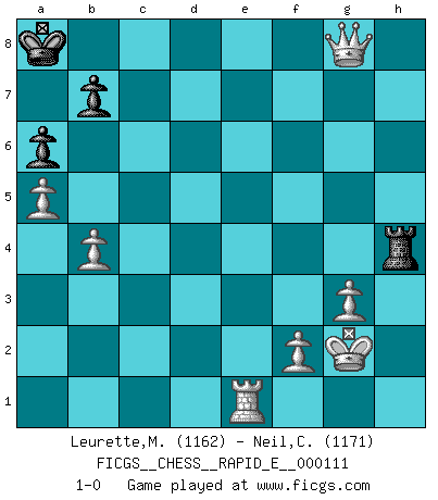 Last move : 1-0 2013 November 1 13:39:56 [Event "FICGS__CHESS__RAPID_E__000111"] [Site "FICGS"] [Date "2013.09.03"] [Round "1"] [White "Leurette,Marc-Antoine"] [Black "Neil,Charlie"] [Result "1-0"] [WhiteElo "1162"] [BlackElo "1171"] 1.e4 e6 2.d4 d5 3.e5 c5 4.Nf3 Nc6 5.c3 Qb6 6.a3 Nge7 7.dxc5 Qxc5 8.b4 Qb6 9.Be3 Qc7 10.Bc5 Ng6 11.Bxf8 Rxf8 12.Bb5 Bd7 13.O-O Ncxe5 14.Bxd7+ Qxd7 15.Nxe5 Nxe5 16.Re1 Nc4 17.Nd2 Nxd2 18.Qxd2 Qe7 19.Qd4 Qd6 20.Qxg7 O-O-O 21.Qxh7 Qc6 22.Qg7 Kb8 23.Qe5+ Ka8 24.Rad1 Rg8 25.g3 Qb5 26.h4 Qc4 27.Rd4 Qxc3 28.Rxd5 exd5 29.Qxc3 Rc8 30.Qf3 Rc4 31.Qxf7 R4c8 32.Qxd5 Rcd8 33.Qg2 Rd3 34.Qe4 R3d8 35.Kg2 Rh8 36.a4 a6 37.a5 Rdg8 38.Qd5 Rxh4 39.Qxg8+ 1-0 French : Advance, Nimzovich system Kingside Castling by player White (move 13) Queenside Castling by player Black (move 20) Player White won this chess game. Follow this game move after move (download)Good positions don't win games, good moves do. (Gerald Abrahams) Schach ist mein Leben, meine Leidenschaft, was ich gelernt habe und seit meinem 14. Lebensjahr profimässig praktiziere. Darauf zu verzichten, würde mir sehr schwer fallen. (Viktor Kortschnoi) Cuando le juegas a Fischer, no es una cuestion de si vas a ganar o perder. Es una cuestion de si vas a sobrevivir. (Boris Spassky) Il vaut mieux sacrifier les pièces de l'adversaire. (Xavier Tartacover) It's only after you lost everything, Tyler says, that you're free to do anything. (Chuck Palahniuk, Fight Club)