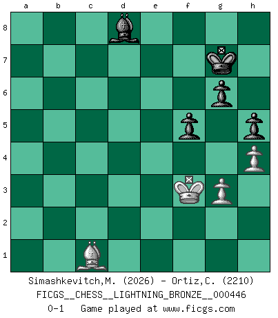 Last move : 0-1 2013 September 5 1:18:52 [Event "FICGS__CHESS__LIGHTNING_BRONZE__000446"] [Site "FICGS"] [Date "2013.09.04"] [Round "1"] [White "Simashkevitch,Mykola"] [Black "Ortiz,Clodomiro"] [Result "0-1"] [WhiteElo "2026"] [BlackElo "2210"] 1.e4 e6 2.d4 d5 3.Nc3 Nf6 4.e5 Nfd7 5.f4 c5 6.Nf3 Nc6 7.Be3 Qb6 8.Na4 Qa5+ 9.c3 c4 10.b4 Qc7 11.g3 b5 12.Nc5 a5 13.a3 Be7 14.Bh3 Nxc5 15.dxc5 O-O 16.O-O Ra6 17.Qd2 Qa7 18.Rab1 g6 19.Qe1 Bd7 20.Rf2 axb4 21.axb4 Ra8 22.Bg2 Bc8 23.Nd4 Nxd4 24.Bxd4 Qd7 25.Rd2 h6 26.Qf2 Qc7 27.Bf3 Qc6 28.R1b2 Ra1+ 29.Kg2 R8a4 30.h4 h5 31.Ra2 R1xa2 32.Rxa2 Qa8 33.Rxa4 bxa4 34.Qa2 a3 35.Be3 Bb7 36.Kh2 Kg7 37.Bg2 Bc6 38.Bc1 d4 39.cxd4 Bxg2 40.Qxg2 Qa6 41.Qa2 c3 42.Bxa3 Qd3 43.Qf2 Qc4 44.Bc1 Qxb4 45.Qe3 Qc4 46.Kg2 Bd8 47.Kh2 Kg8 48.Qe4 c2 49.Kg2 Ba5 50.Qe3 Kf8 51.f5 exf5 52.Bb2 Ke7 53.Kh2 Kd7 54.Bc1 Kc6 55.Qf3+ Kb5 56.Qb7+ Ka4 57.Qg2 Kb4 58.Qf2 Kb5 59.Qf3 Qxd4 60.Qb3+ Bb4 61.Qxc2 Bxc5 62.Qb3+ Kc6 63.Qf3+ Kc7 64.Bf4 Qf2+ 65.Qxf2 Bxf2 66.e6 Kd8 67.Kg2 Bb6 68.exf7 Ke7 69.Be5 Kxf7 70.Kf3 Ke6 71.Bb8 Bd8 72.Kf4 Kd5 73.Ba7 Bf6 74.Bb6 Ke6 75.Bg1 Be5+ 76.Kf3 Kd5 77.Be3 Bc7 78.Bc1 Ke6 79.Be3 Bd6 80.Bd2 Kd5 81.Be1 Be5 82.Bd2 Ke6 83.Ba5 Kf6 84.Bd8+ Kf7 85.Bg5 Ke6 86.Be3 Bb8 87.Bg5 Bc7 88.Be3 Ke7 89.Bg5+ Kd7 90.Bf6 Ke6 91.Bd4 Bd6 92.Be3 Kf6 93.Bg5+ Kf7 94.Be3 Bc7 95.Bd2 Kf6 96.Bg5+ Kg7 97.Bc1 Bd8 0-1 This chess game has been lost on time (started : 2013.09.04 17:53:5) French : Steinitz, Boleslavsky variation Kingside Castling by player Black (move 15) Kingside Castling by player White (move 16) 10 pieces endgame at move 68 : White KBPPP , Black KBPPP WHITE : King + 1 Bishop 3 Pawns BLACK : King + 1 Bishop 3 Pawns 9 pieces endgame at move 69 : White KBPP , Black KBPPP WHITE : King + 1 Bishop 2 Pawns BLACK : King + 1 Bishop 3 Pawns Player Black won this chess game. Follow this game move after move (download)The tactician must know what to do whenever something needs doing; the strategist must know what to do when nothing needs doing. (Savielly Tartakover) Schach ist wie eine schöne Frau, zu der wir ständig zurückkehren, gleichviel, wie oft sie uns zurückweist. (Anonymous) Un juego de Ajedrez es un dialogo, una conversación entre un jugador y su oponente. Cada movimiento del oponente puede contener amenazas o tropiezos, pero un jugador no se puede defender de las amenazas o tomar ventaja de los tropiezos si es que no se pregunta a sí mismo: ¿Que es lo que mi oponente va a hacer después de cada movida?. (Bruce A. Moon) Les Echecs mettent en conflit, non pas deux intelligences, mais deux volontés. (Lasker) See no evil, hear no evil, speak no evil. (The 3 monkeys)