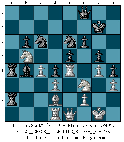 Last move : 0-1 2013 September 4 19:36:25 [Event "FICGS__CHESS__LIGHTNING_SILVER__000275"] [Site "FICGS"] [Date "2013.09.04"] [Round "1"] [White "Nichols,Scott"] [Black "Alcala,Alvin"] [Result "0-1"] [WhiteElo "2393"] [BlackElo "2491"] 1.g3 d5 2.Bg2 e5 3.c4 d4 4.d3 c5 5.e3 Nf6 6.Nf3 Nc6 7.O-O Be7 8.exd4 cxd4 9.Re1 Nd7 10.Bd2 O-O 11.Na3 Re8 12.Rb1 a5 13.Nb5 f6 14.Nh4 Nc5 15.Bd5+ Be6 16.Bxe6+ Nxe6 17.a3 Bf8 18.b4 axb4 19.axb4 Ra2 20.Nf5 g6 21.Nh4 Qd7 22.Nf3 Rea8 23.Re4 R2a4 24.Qe1 b6 25.h3 Ra2 26.Qd1 Qf7 27.Re2 R2a4 28.Qe1 g5 29.Re4 h5 30.Re2 Qg6 31.Re4 Kg7 32.Rb2 Ra1 33.Rb1 R1a2 34.Qd1 R8a4 35.Qe1 Be7 36.Kg2 h4 37.g4 Qe8 38.Kg1 Qf8 39.Rd1 Bxb4 0-1 Benko's Opening Kingside Castling by player White (move 7) Kingside Castling by player Black (move 10) Player Black won this chess game. Follow this game move after move (download)Though most people love to look at the games of the great attacking masters, some of the most successful players in history have been the quiet positional players. They slowly grind you down by taking away your space, tying up your pieces, and leaving you with virtually nothing to do ! (Yasser Seirawan) Nicht daß Diemer aus Opportunismus Mitglied der NSDAP geworden wäre. Er war ein Fanatiker, in allem, was er tat. (Hans Ree) En la vida, como en el Ajedrez, los Peones propios obstruyen nuestro camino. La gran fortuna de un hombre, su comodidad, placer, hijos, libros, que deberían ayudarle a ganar, con mucha frecuencia lo ponen en Jaque Mate. (Charles Buxton) Aux échecs, l'amour-propre est satisfait quand on remporte la victoire, mais il n'y a pas de honte à être battu. (Benjamin Franklin) Warrior pose battles inner weakness and wins focus. You see that there is no war within you. You're on your own side, and you are your own strength. (Terri Guillemets)
