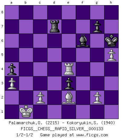 Last move : 1/2-1/2 2013 December 16 11:25:36 [Event "FICGS__CHESS__RAPID_SILVER__000133"] [Site "FICGS"] [Date "2013.09.06"] [Round "2"] [White "Palamarchuk,Oleg"] [Black "Kokoryukin,Sergey"] [Result "1/2-1/2"] [WhiteElo "2215"] [BlackElo "1940"] 1.e4 c5 2.Nf3 d6 3.d4 cxd4 4.Nxd4 Nf6 5.Nc3 a6 6.Be3 e6 7.f3 b5 8.a3 h5 9.Qd2 Nbd7 10.Be2 Bb7 11.O-O-O Be7 12.Kb1 Rc8 13.Rhg1 Ne5 14.Bg5 O-O 15.h3 Rxc3 16.Qxc3 Nxe4 17.fxe4 Bxg5 18.Bxh5 Bxe4 19.Bf3 Bg6 20.Nc6 Qc7 21.Nxe5 Qxc3 22.bxc3 dxe5 23.Bb7 Rb8 24.Rd7 a5 25.Re1 Bf4 26.Red1 Kh7 27.h4 Bg3 28.Rh1 Kh6 29.h5 Bf5 30.Rxf7 e4 31.Re7 e3 32.Be4 Bg4 33.Bf3 Bf5 34.Kb2 Rc8 35.Rb7 Rc5 36.Rg1 a4 37.Be2 Bh2 38.Rb1 Bg3 39.Rf1 Be5 40.Kb1 Rxc3 41.Rxf5 exf5 42.Rxb5 Bf6 43.Rxf5 Rc7 44.Rf4 Rb7+ 45.Rb4 Rd7 46.Re4 1/2-1/2 Sicilian : Najdorf, Byrne (English) attack Queenside Castling by player White (move 11) Kingside Castling by player Black (move 14) This chess game ended in a draw. Follow this game move after move (download)Openings teach you openings. Endgames teach you chess ! (Stephan Gerzadowicz) Alle Schachspieler sollten auch ein Hobby haben. (Savielly Grigorievitsch Tartakower) El hombre es un frívolo, una creatura engañosa y como un jugador de Ajedrez, se preocupa mas por el proceso de obtener su meta que de la meta por sí misma. (Dostoyevsky) Mon pion favori sur ma case favorite ! Bronstein en parlant d'un coup de pion en h5 quand il avait les Noirs. The message for business people contemplating their place in the cyberspace is simple and direct: get linked or get lost. (Vic Sussman and Kenan Pollack)
