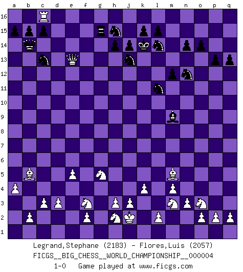 Last move : 1-0 2014 January 4 13:28:52 [Event "FICGS__BIG_CHESS__WORLD_CHAMPIONSHIP__000004"] [Site "FICGS"] [Date "2013.09.06"] [Round "1"] [White "Legrand,Stephane"] [Black "Flores,Luis"] [Result "1-0"] [WhiteElo "2183"] [BlackElo "2057"] 1.m2-m4 j15-k13 2.p1-o3 p16-o14 3.b1-c3 g16-f14 4.e2-e4 b16-c14 5.j2-k4 k16-l14 6.h2-g4 h15-g13 7.l1-o4 e15-e13 8.n2-n3 f16-c13 9.f1-b5 m15-m13 10.d2-d3 d15-d14 11.o1-f9 l16-p12 12.h1-p8 n15-n14 13.m1-m3 c16-l8 14.k1-h2 l8-n10 15.p8-e8 o16-g9 16.c1-k8 o14-n12 17.m3-l3 l14-j13 18.q1-m1 m16-m14 19.k8-h10 m14-l14 20.l3-l14 j13-l14 21.h10-g9 c13-g9 22.e8-e9 g9-b14 23.m1-m3 f14-h15 24.m3-l3 e16-e14 25.e1-e3 e14-f14 26.e3-f3 a16-e16 27.f9-c12 f14-f3 28.g1-f3 e16-d16 29.c12-a10 d14-d13 30.a10-d7 g13-e12 31.e9-j9 h16-m12 32.j9-j4 h15-j13 33.o4-j9 m12-p9 34.j9-p3 k13-l11 35.a1-e1 d16-d14 36.j4-m7 p9-k9 37.m7-o7 o15-o14 38.o7-f15 j16-h15 39.k4-m3 d14-f14 40.f15-d13 e12-g13 41.p3-q4 q16-f16 42.d13-b11 f14-f11 43.b11-c10 h15-j15 44.e4-e5 f11-f10 45.c10-k3 k9-f13 46.e1-e4 f10-f4 47.k3-k8 f4-f8 48.k8-m6 f8-f4 49.q4-l9 f4-e4 50.c3-e4 f13-a8 51.a2-a4 a8-d5 52.d7-e6 d5-d11 53.m6-q10 b14-a13 54.k2-k4 q15-q13 55.e6-d7 j15-k16 56.q10-n7 g13-h15 57.n7-l5 a13-b14 58.l9-j7 b14-a13 59.c2-c3 d11-g8 60.b5-c4 g8-b13 61.d7-b5 f16-f8 62.l5-l10 n10-m9 63.l10-h10 p15-p13 64.j7-n11 m13-m12 65.n11-h6 f8-j8 66.h6-a13 b13-a13 67.h10-g10 m9-k7 68.g10-g15 k16-j15 69.j1-k2 a13-b14 70.g4-h6 j8-h8 71.h6-k7 p12-k7 72.l3-l7 k7-h5 73.c4-f7 h5-j6 74.f7-k3 h8-g8 75.g15-f15 g8-g2 76.k2-j2 g2-g13 77.e4-g5 j6-p12 78.l7-f7 c14-d12 79.f15-d15 p12-m9 80.f7-f16 j15-k14 81.f16-c16 d12-e14 82.k3-m5 g13-g15 83.d15-d13 e14-c13 84.d13-e13 1-0 Follow this game move after move (download)A man without frontiers. He didn't divide the East and the West, he brought them together in their admiration for him. (Ljubomir Ljubojevic, about Bobby Fischer's death) Karpov ist ein Museumsstück. (Garry Kasparov) El tablero es el mundo, las piezas es el fenomeno del universo, las reglas del juego son lo que llamamos leyes de la naturaleza y el jugador del lado opuesto, se encuentra oculto a nuestra vista. (Thomas Huxley) La tactique, c'est ce que vous faites quand il y a quelque chose à faire; la stratégie, c'est ce que vous faites quand il n'y a rien à faire. (Savielli Tartacower) It is not enough to be a good player... you must also play well. (Siegbert Tarrasch)
