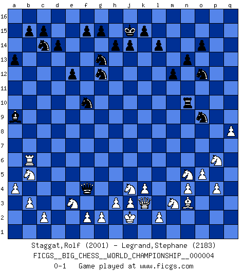 Last move : 0-1 2014 March 19 4:6:41 [Event "FICGS__BIG_CHESS__WORLD_CHAMPIONSHIP__000004"] [Site "FICGS"] [Date "2013.09.06"] [Round "1"] [White "Staggat,Rolf"] [Black "Legrand,Stephane"] [Result "0-1"] [WhiteElo "2001"] [BlackElo "2183"] 1.j2-k4 p16-o14 2.h2-g4 b16-c14 3.b1-c3 e15-e13 4.d2-d4 j15-k13 5.e2-e4 h15-g13 6.m2-m4 m15-m13 7.n2-n4 f16-c13 8.p1-o3 d15-d14 9.l1-p5 k16-h15 10.c1-h6 l16-p12 11.o1-j6 p12-j6 12.k4-j6 h16-l13 13.k1-l3 l13-d6 14.h1-h2 d6-d4 15.g1-f3 d4-b6 16.a1-b1 n15-n14 17.j6-l5 a15-a13 18.h6-e3 b6-b11 19.l3-j4 a16-a14 20.e1-d1 a14-b14 21.f1-b5 g16-j15 22.j1-j2 o16-j11 23.q2-q4 c16-h11 24.a2-a4 b11-c12 25.k2-k3 e16-e14 26.d1-d5 e14-f14 27.m1-m3 m13-m12 28.q1-d1 m16-m13 29.p5-j11 k13-j11 30.o3-n5 m13-o13 31.o2-o3 o13-q13 32.h2-d6 j15-k13 33.d6-o6 h15-j13 34.o3-o4 q13-o13 35.o6-q6 b14-b10 36.d5-d10 f14-f10 37.d10-b10 f10-b10 38.p2-p3 b10-p10 39.b5-h11 j13-h11 40.d1-d7 o13-o10 41.q6-b6 c13-b12 42.e3-g5 q16-m16 43.o4-o5 o10-o9 44.n5-p6 p10-p9 45.b6-d4 o9-b9 46.f3-e1 c12-b11 47.c3-b5 p9-d9 48.b1-d1 h11-f10 49.d4-k10 j11-g12 50.k10-k12 o14-m13 51.k12-e7 d9-d7 52.d1-d7 b11-a10 53.b2-b3 b9-e9 54.e7-h7 a10-e10 55.h7-q15 e9-e4 56.g4-e3 k13-m14 57.q15-p15 e10-f9 58.d7-d2 f9-j9 59.e1-f3 e4-e11 60.p15-p13 o15-o14 61.p13-p12 m14-o13 62.d2-d6 b12-c11 63.p12-n12 m16-m14 64.k3-k4 c11-a9 65.d6-d4 m14-l14 66.n12-n5 j9-q9 67.n5-m5 q9-q5 68.p6-o4 q5-q7 69.m5-n6 a9-d12 70.n6-p6 q7-q9 71.p6-n6 q9-q12 72.f3-h4 e11-p11 73.h4-k3 q12-p12 74.o4-p6 e13-e12 75.m3-l3 p11-l11 76.j2-k2 o13-n11 77.g5-h4 n14-n13 78.l5-m3 p12-p10 79.l3-l11 l14-l11 80.k3-l5 j16-j15 81.p3-p4 p10-h10 82.q4-q5 d12-e13 83.q5-q6 l11-l10 84.q6-q7 h10-q2 85.q7-q8 q2-p1 86.m3-n5 p1-m4 87.k2-k3 m13-o12 88.d4-d6 l15-l14 89.h4-k6 m4-n3 90.k3-j2 l10-n10 91.n6-m5 n3-l1 92.m5-k3 n11-o9 93.l5-m3 l1-q1 94.m3-o2 q1-q6 95.k6-n3 q6-m10 96.o2-m3 e13-a9 97.d6-b6 m10-f4 0-1 This big chess game has been lost on time (started : 2013.09.06 10:51:17) Follow this game move after move (download)There is no remorse like the remorse of Chess. (H. G. Wells) Spielt Blackmar-Diemer-Gambit, und das Matt kommt von selbst! (Emil Joseph Diemer) El jugador blanco perdió porque fallo en recordar la coreccta continuación y tuvo que pensar por sí mismo las movidas. (Siegbert Tarrasch) Les échecs sont un jeu par leur forme, un art par leur essence et une science par sa difficulté d'acquisition. Ils peuvent vous procurer autant de plaisir qu'un bon livre ou une belle musique, mais vous n'aurez une réelle joie que si vous arrivez à bien jouer. (Tigran Petrosian) The man who strikes first admits that his ideas have given out. (Chinese proverb)