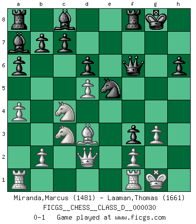 Last move : 0-1 2007 July 20 4:55:48 [Event "FICGS__CHESS__CLASS_D__000030"] [Site "FICGS"] [Date "2007.02.06"] [Round "1"] [White "Miranda,Marcus"] [Black "Laaman,Thomas"] [Result "0-1"] [WhiteElo "1481"] [BlackElo "1661"] 1.e4 e5 2.Nf3 Nc6 3.Bb5 Nf6 4.O-O Bc5 5.c3 O-O 6.d4 Bb6 7.Bg5 h6 8.Bh4 exd4 9.cxd4 g5 10.Bg3 Nxe4 11.d5 Nxg3 12.hxg3 Ne7 13.Nc3 d6 14.a4 a6 15.Bd3 Ng6 16.Re1 g4 17.Nd2 f5 18.Nc4 Ba7 19.Ne2 Qf6 20.Qd2 f4 21.Rf1 f3 22.gxf3 gxf3 23.Nc3 Ne5 0-1 Ruy Lopez : Berlin defense, Beverwijk variation Kingside Castling by player White (move 4) Kingside Castling by player Black (move 5) Player Black won this chess game. Follow this game move after move (download)A great player and a great example for many. His book My 60 Memorable Games had a big impact on me. It is a shame he didn't continue to enrich the world of chess with his unparalleled understanding after 1972. (Jan Timman, about Bobby Fischer's death) Mein Gehirn das ist mein zweitwichtigstes Organ [Aus dem Film: Der Schläfer]. (Woody Allen) Cada Peón es potencialmente una Reina. (James Mason) Toutes les manuvres exécutées sur une colonne ouverte ont pour but ultime l'intrusion définitive sur la septième ou la huitième rangée, en plein cur de la position ennemie. (Aaron Nimzovitch) If you are good, you will be assigned all the work. If you are really good, you will get out of it. (Dan Rotaru)