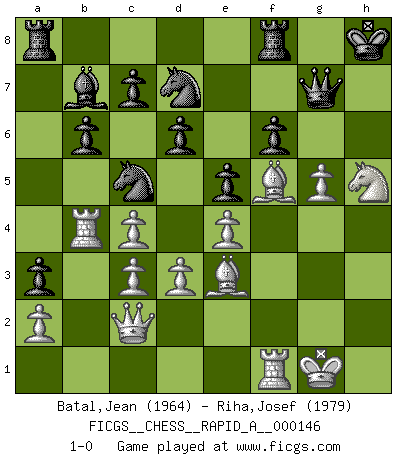 Last move : 1-0 2013 September 30 9:27:48 [Event "FICGS__CHESS__RAPID_A__000146"] [Site "FICGS"] [Date "2013.09.06"] [Round "1"] [White "Batal,Jean"] [Black "Riha,Josef"] [Result "1-0"] [WhiteElo "1964"] [BlackElo "1979"] 1.c4 Nf6 2.Nc3 e5 3.g3 Bb4 4.Bg2 O-O 5.e4 Bxc3 6.bxc3 d6 7.Ne2 b6 8.d3 Nbd7 9.O-O Re8 10.h3 Nc5 11.Be3 Qe7 12.f4 Nfd7 13.f5 a5 14.g4 Ba6 15.g5 f6 16.h4 a4 17.Ng3 Kh8 18.Rb1 a3 19.Bf3 Reb8 20.Qc2 Qf7 21.Rb4 Re8 22.Bh5 g6 23.fxg6 hxg6 24.Bg4 Rf8 25.h5 Bb7 26.hxg6 Qxg6 27.Bf5 Qg7 28.Nh5 1-0 English Opening Kingside Castling by player Black (move 4) Kingside Castling by player White (move 9) Player White won this chess game. Follow this game move after move (download)Life is like a game of Chess, changing with each move. (Chinese proverb) Heutzutage gewinnt im Turnier nicht derjenige Spieler, der weitreichende Pläne entwirft, sondern einfach jener, der Zug um Zug kämpft. (David Bronstein) Fischer es una tragedia del Ajedrez Americano a la par con Morphy y Pillsbury. (Mig Greengard) Aux échecs, l'amour-propre est satisfait quand on remporte la victoire, mais il n'y a pas de honte à être battu. (Benjamin Franklin) . 'gn is not allowed in chess unless n is an integer between 1 and 8 inclusive, where 1 and 8 are to interpreted as the standard numerals standing for integers in the ordered real-closed field R, with the *canonical* ordering. (As opposed to, say, an integer in the domain Z[2+i*sqrt(5)] or an integer in some exotic Grothendieck topos). (Normajean Yates)